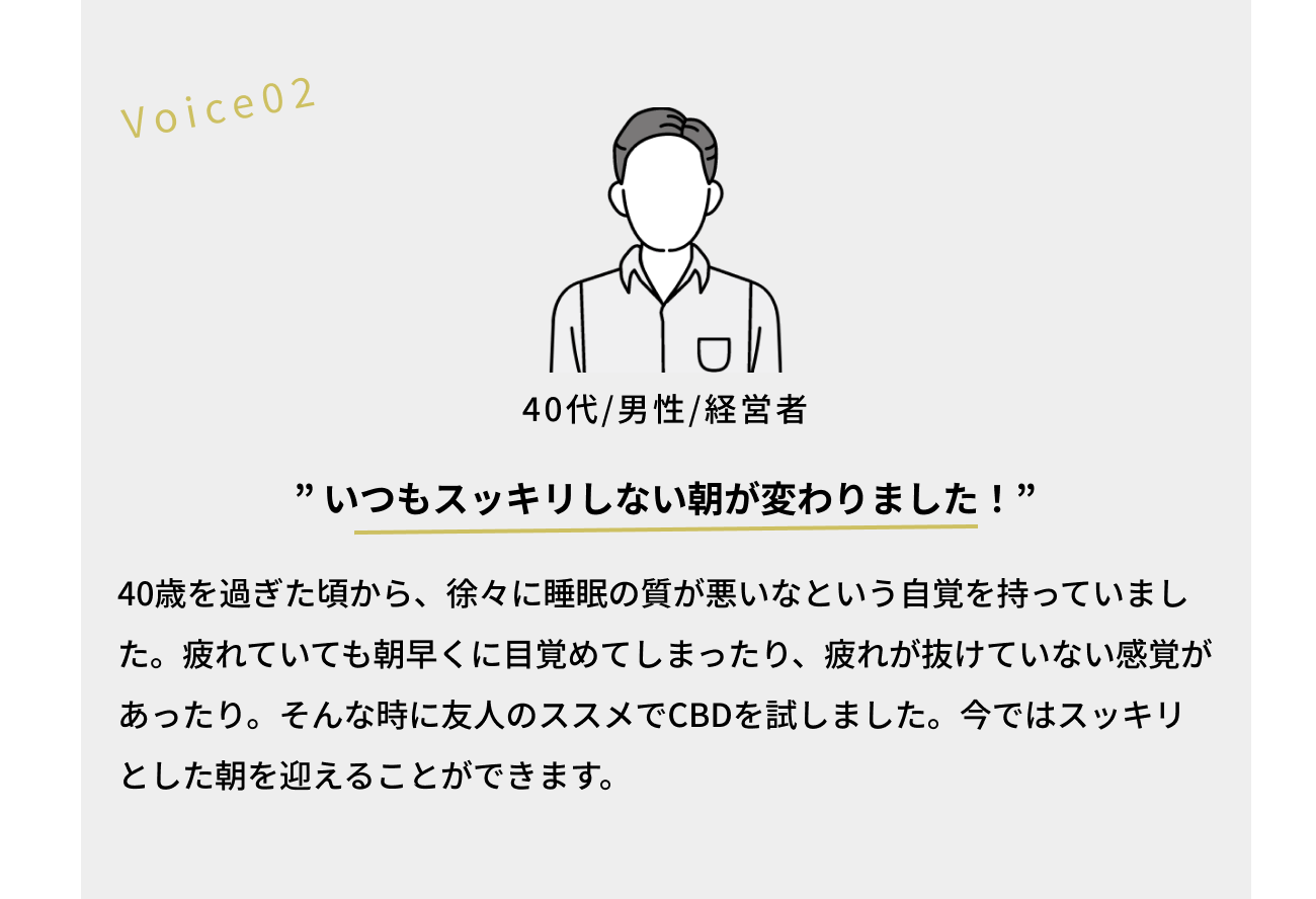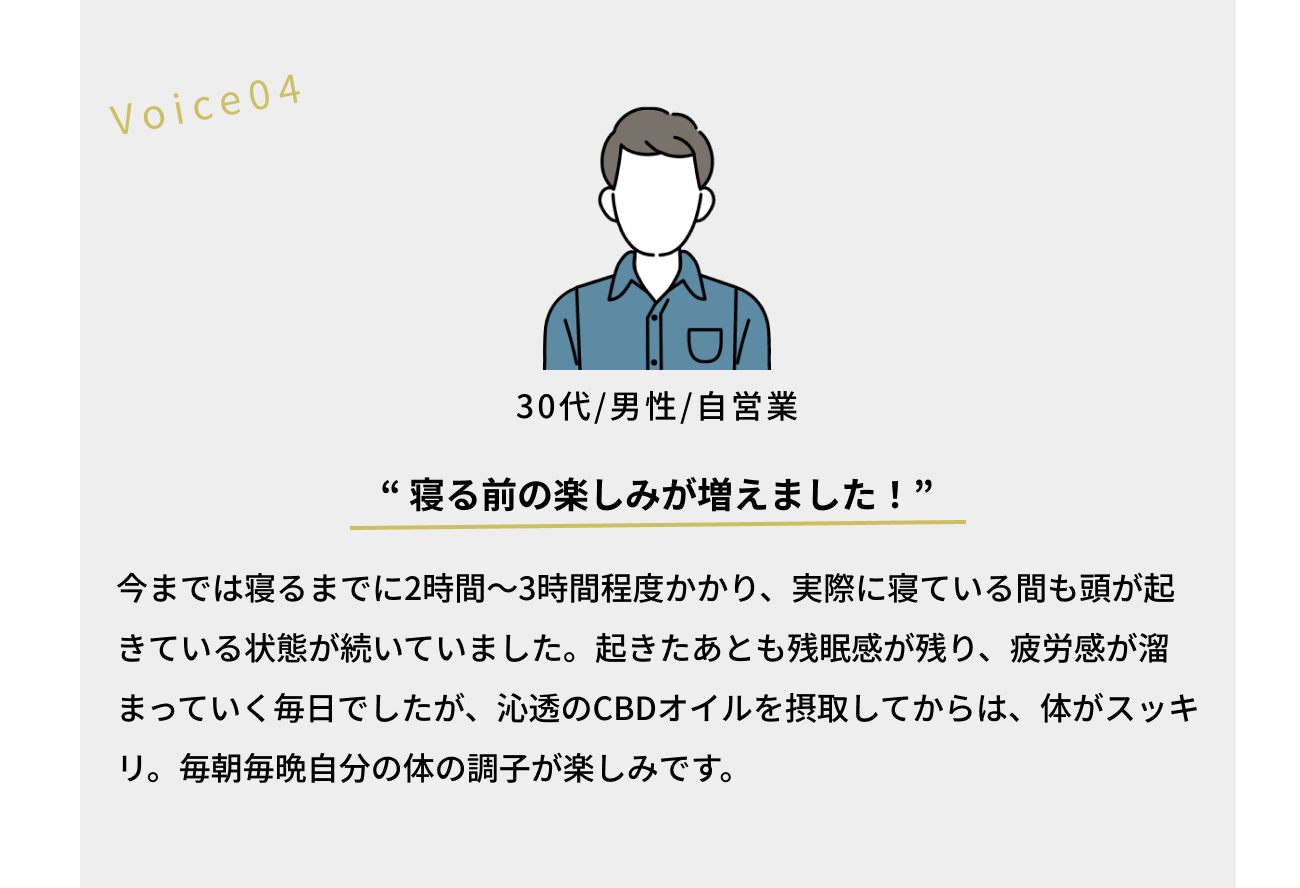 ですが、ある時友人の紹介で出会ったアメリカでCBD製品を扱っている方(現在沁透の役員)との出会いで、大きな転機を迎えました。もともとCBDというものを知らなかった私は、CBD水溶液が睡眠の質の改善に良いことを教えてもらい、アメリカで販売されている商品を送っていただきました。