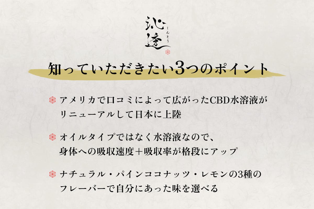 沁透では、今までアメリカだけで展開されていたCBD水溶液を「沁透の理念とコンセプト」に基づいて、独自のブランドとして、日本に展開をしていきます。