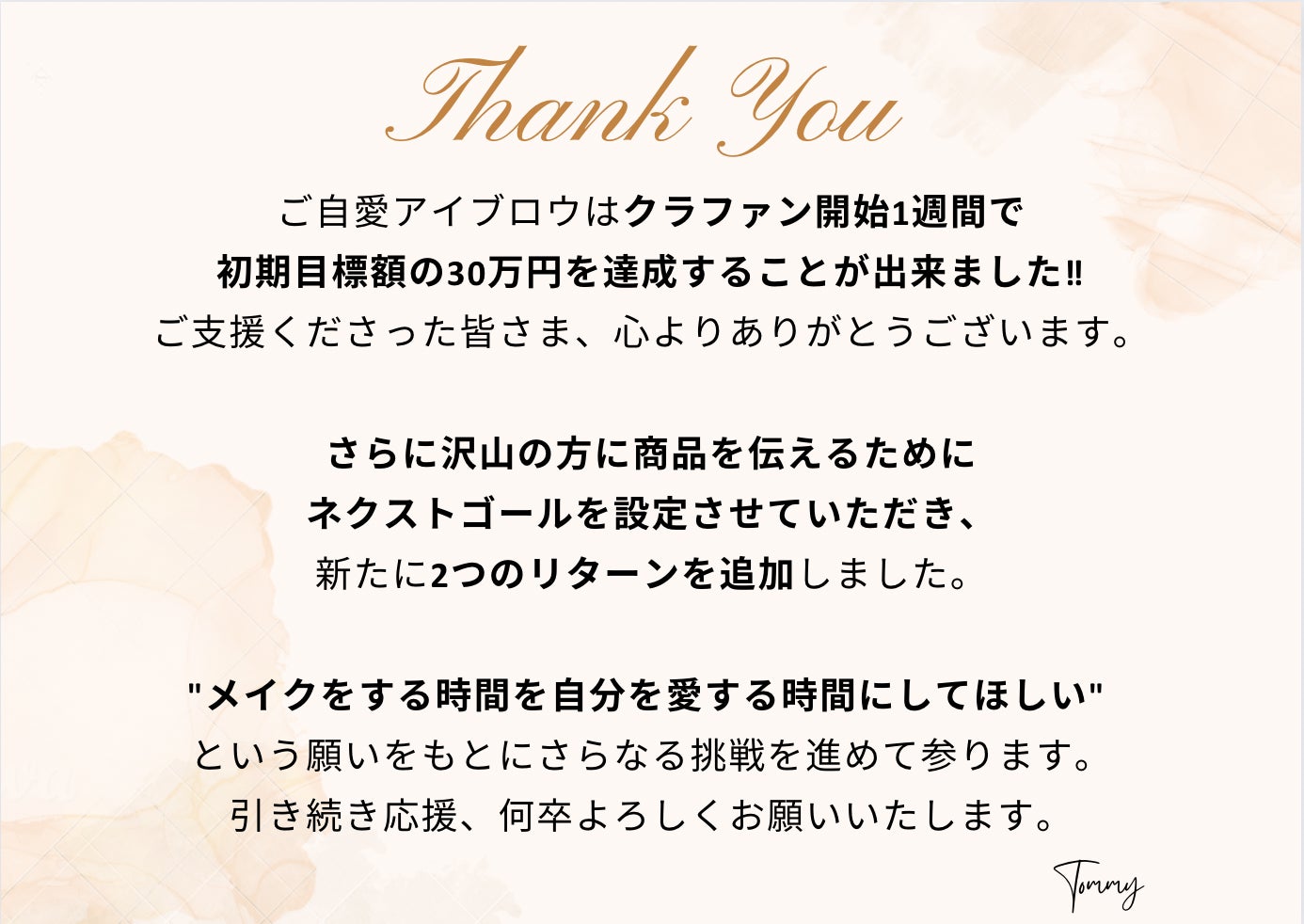 2023/05/04 22:43ご自愛アイブロウは、皆さまの温かいお力添えのお陰で初期目標を達成することができました!全国の皆さまがアイブロウを使用した感想が届きましたので、動画にまとめております。ぜひ、音声をONにしてご覧ください^^「持ちやすい」「描きやすい」というご感想が多く寄せられていて嬉しいです!ご自愛アイブロウは、さらに多くの方に商品をお伝えするためにネクストゴールを設定しCAMPFIREを継続中です。https://camp-fire.jp/projects/view/658587?utm_campaign=cp_po_share_mypage_projects_show5月14日までの開催のため【残り10日】となってます!もしお気に召して頂いた方は、追加のご購入やSNSのご投稿などさらに多くの方に商品の魅力をお伝えするサポートをいただけますと幸いです!今後とも、ご自愛アイブロウをよろしくお願いします。ご自愛アイブロウが、あなたの人生に寄り添う素敵なパートナーになれますように…Tommyより心を込めて。 もっと見る