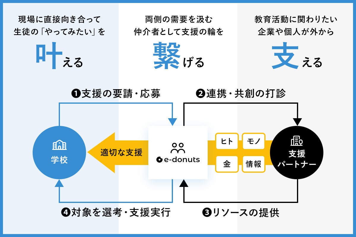 企業や個人が直接支援するのではなく、私たちe-donutsが支援を集約させることで、