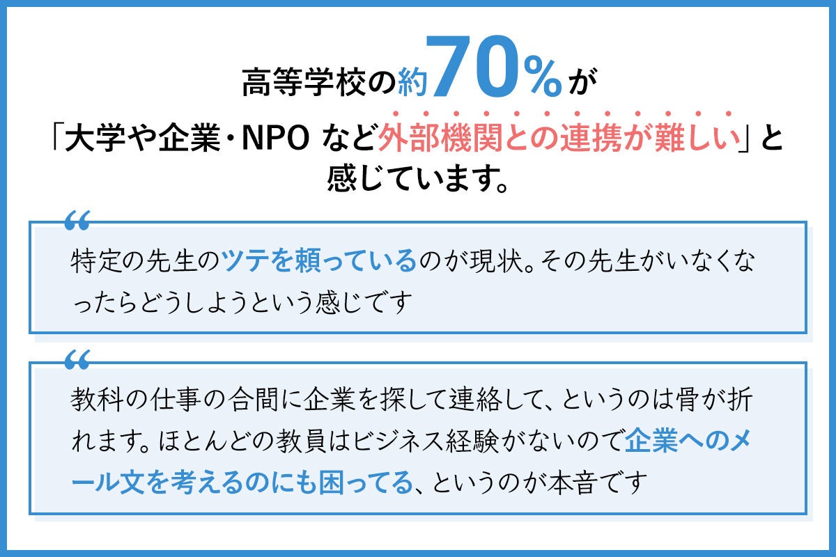 これを補うためには、外部の組織や個人の協力を得る外部連携が重要になります。しかし、多くの学校はこの外部連携に苦心しています。