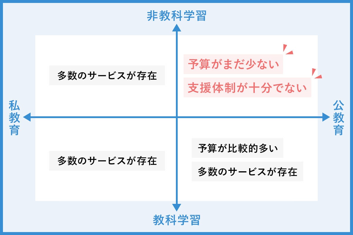 中でも、こちらの図にあるとおり、「公教育×非教科学習」領域(探究、STEAMなど)は、各所でその意義が唱えられている割に、まだまだ予算が不十分で必要な支援が行き届いていないのが現状です。