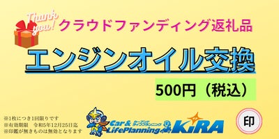 1,000円のクーポン券をご支援ください。当日500円にてオイル交換を行います。