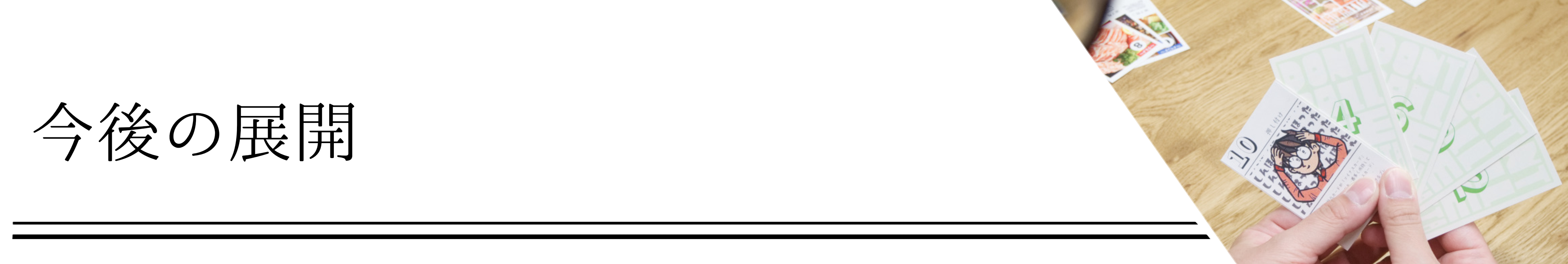 クラウドファンディングの成功後、みなさまにリターン商品をお届けした後、新発田市のカフェなど協力店舗を募り、カードゲームを常設してもらうことで幅広い方に手に取っていただきたいと考えています。カードゲームをプレイしてもらうことで新発田を知ってもらい、楽しんでもらうことはもちろんですが、たくさんの方にプレイしてもらうことで「遊び方」のチューニングをしていき、どんどんその輪を広げていけたらと思っております。