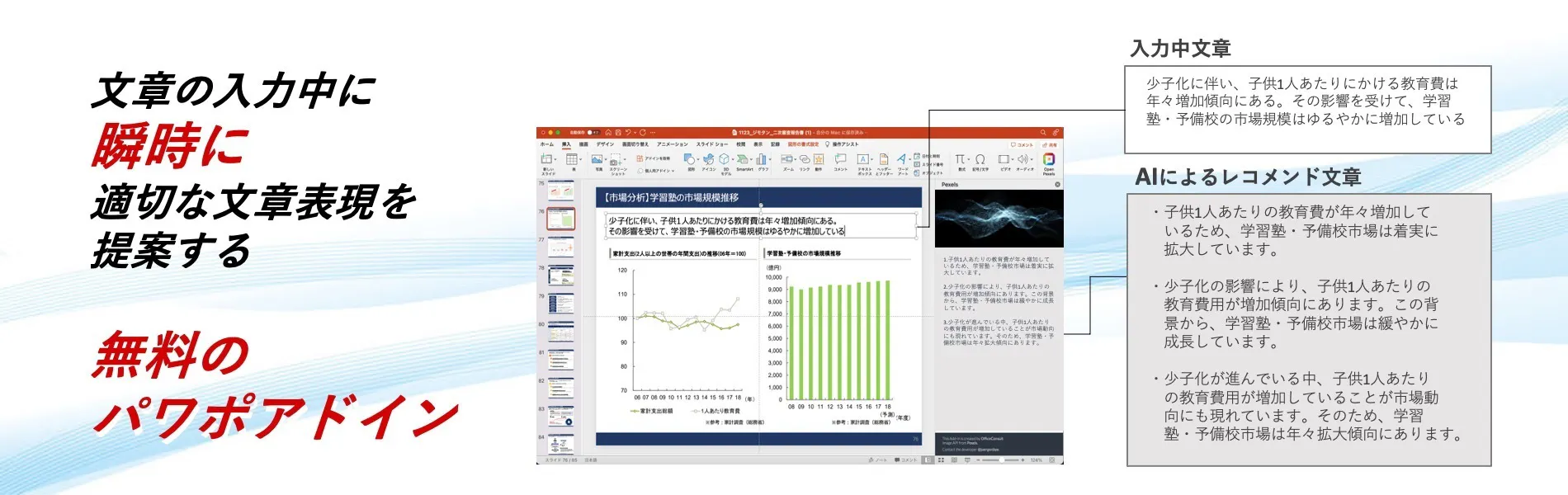 上の絵のように、パワーポイントで資料作り、文章を入力している際、資料右側にリアルタイムに適切な文章表現の候補が複数提示され、そこから文章をコピー&ペーストすることで資料作りの効率を爆発的に高めることが可能になります。
