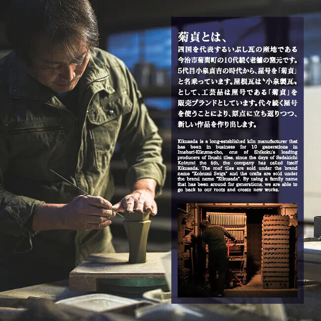 四国を代表するいぶし瓦の産地・今治市菊間町で10代続く老舗の窯元「菊貞」創業300年以上の歴史をもつ、「菊貞」ブランドを展開する小泉製瓦有限会社が製作した菊間瓦を使用します。