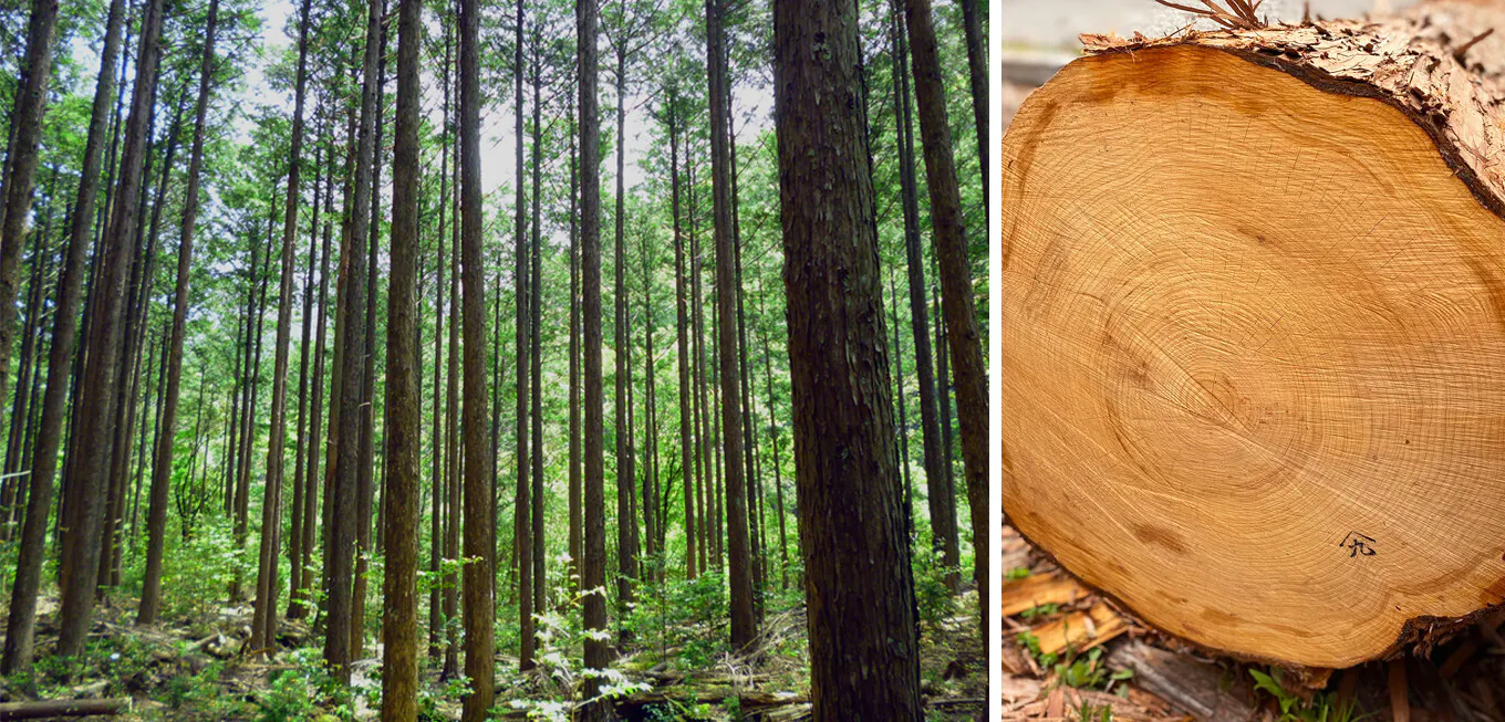 社の素材にはヒノキを使用します。ヒノキは、美しい白さと光沢、そして特有の芳香をもつという特徴があります。 森林浴でのリラックス効果やフレッシュ効果をもたらす清々しいヒノキの香りは、アロマとしても人気があります。また、水気・湿気に強く耐久性が高いため、日本では古来より神社仏閣建築の代表的な樹種として用いられています。