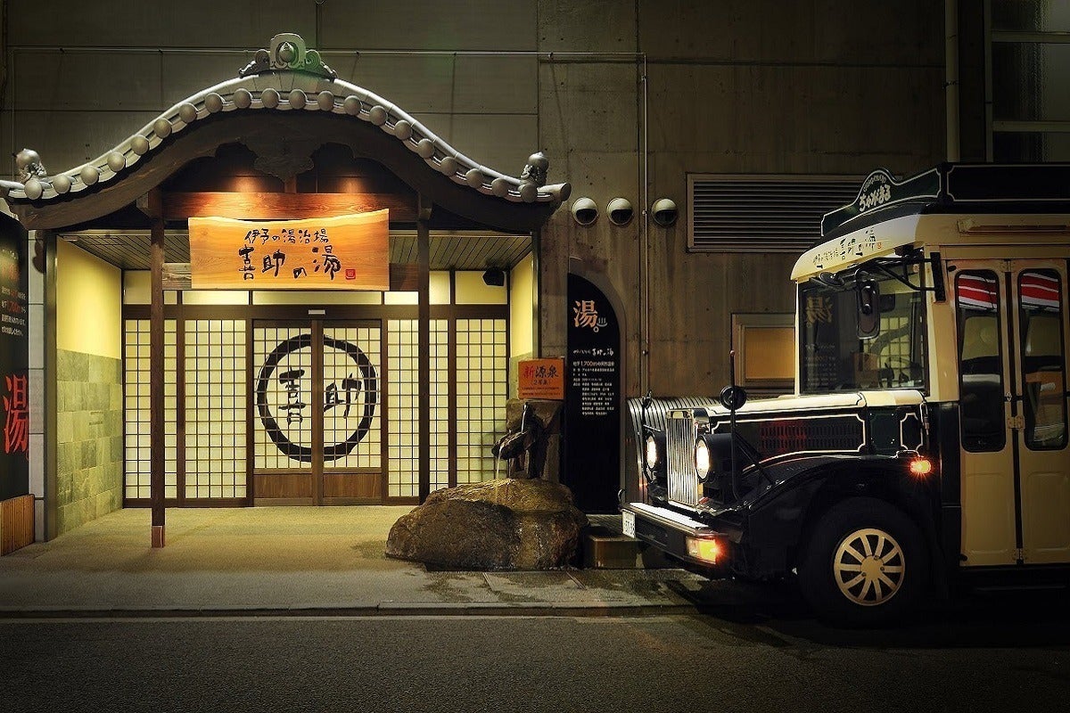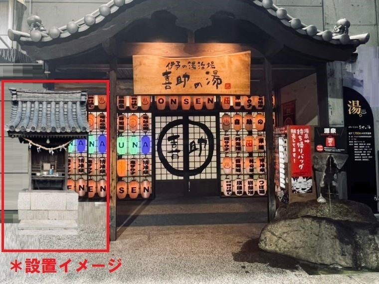 道後温泉まで車で10分の「伊予の湯治場 喜助の湯」(愛媛県松山市宮田町4番地)の玄関前を予定しています。