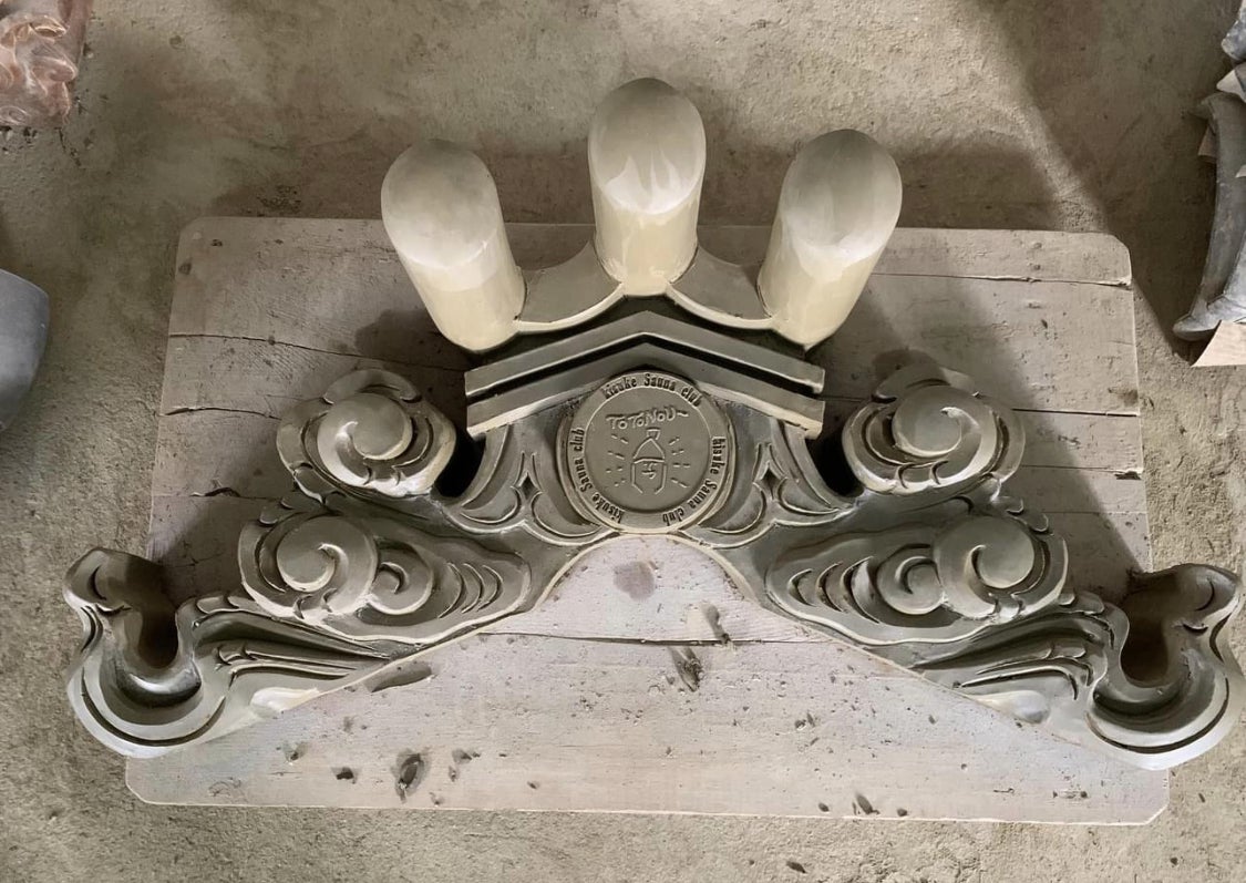 サウナ神社のシンボルとなる巨大鬼瓦は、750年の歴史を誇る菊間瓦の鬼師の職人技により製作されます。家屋を守る厄除けとしての役割があります。
