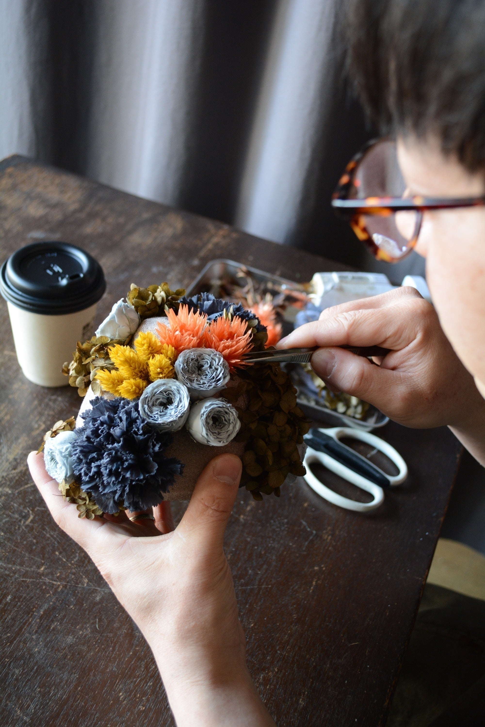 夫婦で営んで参りました。生花の商品をはじめ、花や植物に蝋を合わせた作品や、