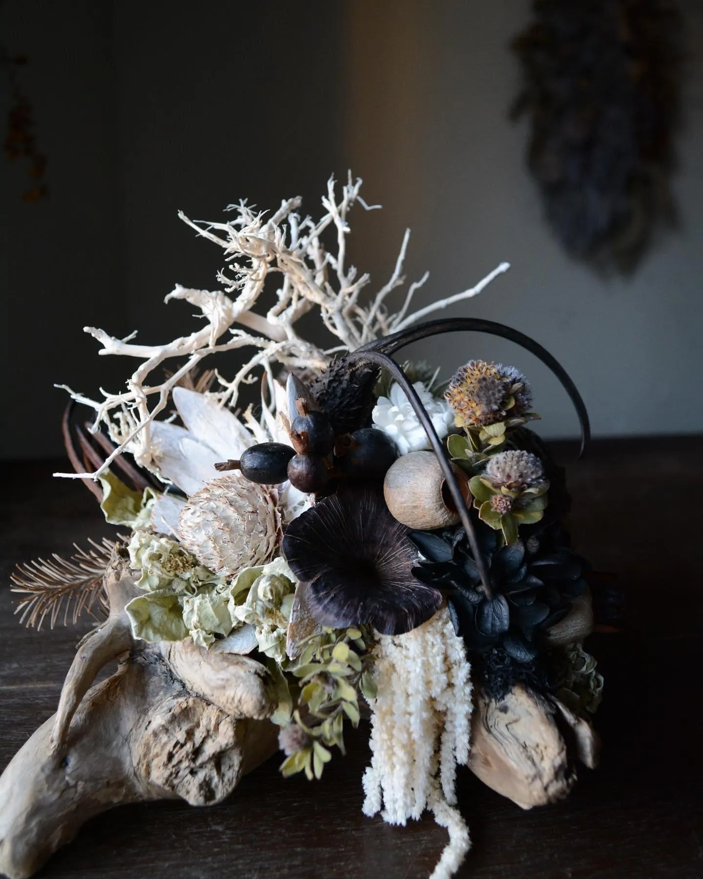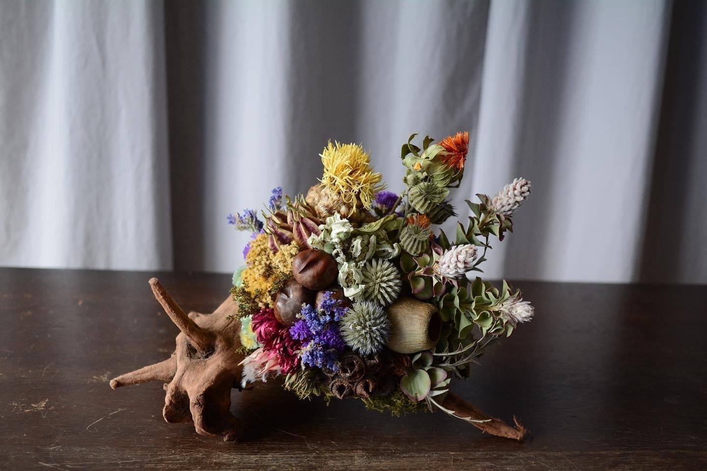 自然が作り出す唯一無二の造形をした流木に、形を生かしながらドライフラワーを合わせてゆきます。