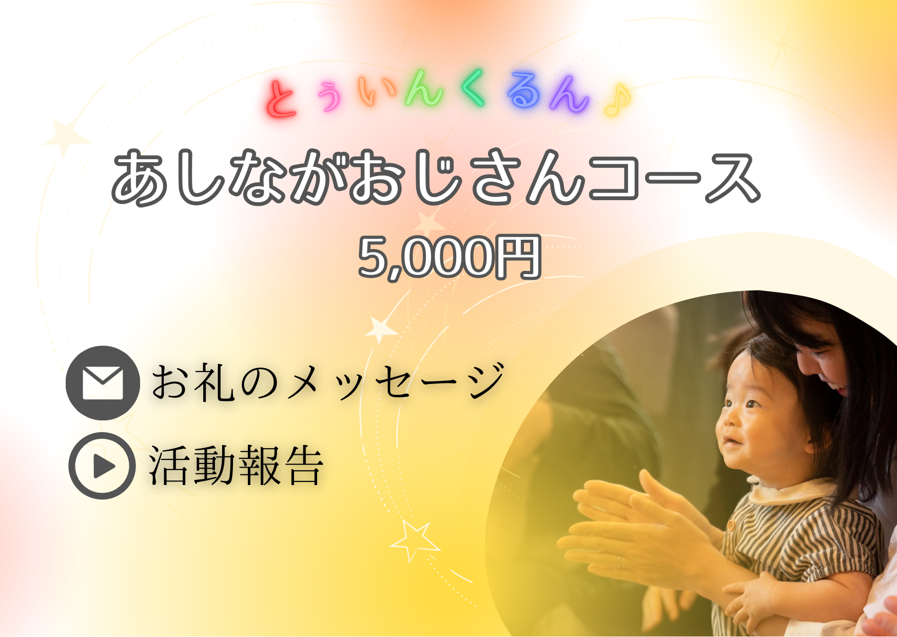 応援・ご支援いただいた皆様、本当にありがとうございます!またこのプロジェクトを見にきて下さった方々もありがとうございます!私たちの活動をより身近に感じていただきたく、PR動画を制作いたしました。ご覧いただければ幸いです。「良いな!」「更に応援したいな!」と思っていただけましたら、ぜひ身近な人やSNS等でシェアいただければ、大変勇気づけられます!ぜひ、ご協力お願いいたします!!!また「支援したいけれど、ちょうどいいリターンが...」というお声を何度かいただきました。早速ではありますが、ご意見を参考にしリターンを追加いたしました!ご共感いただけた方にはぜひ新リターンに目を通していただければ幸いです。子ども達、親子の温かな笑顔のために全力で尽くしてまいります!応援どうぞよろしくお願いいたします!!