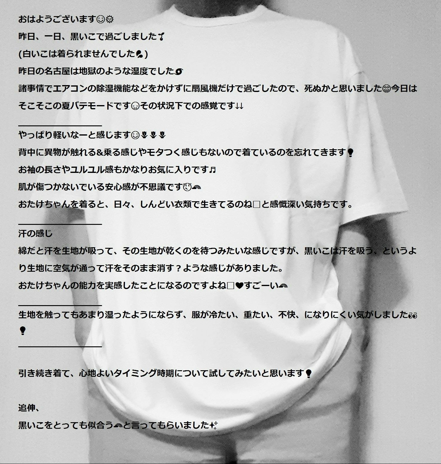 T シャツ届きました。以下報告させて頂きます。文章はご自由に、画像は顔出し NG です。