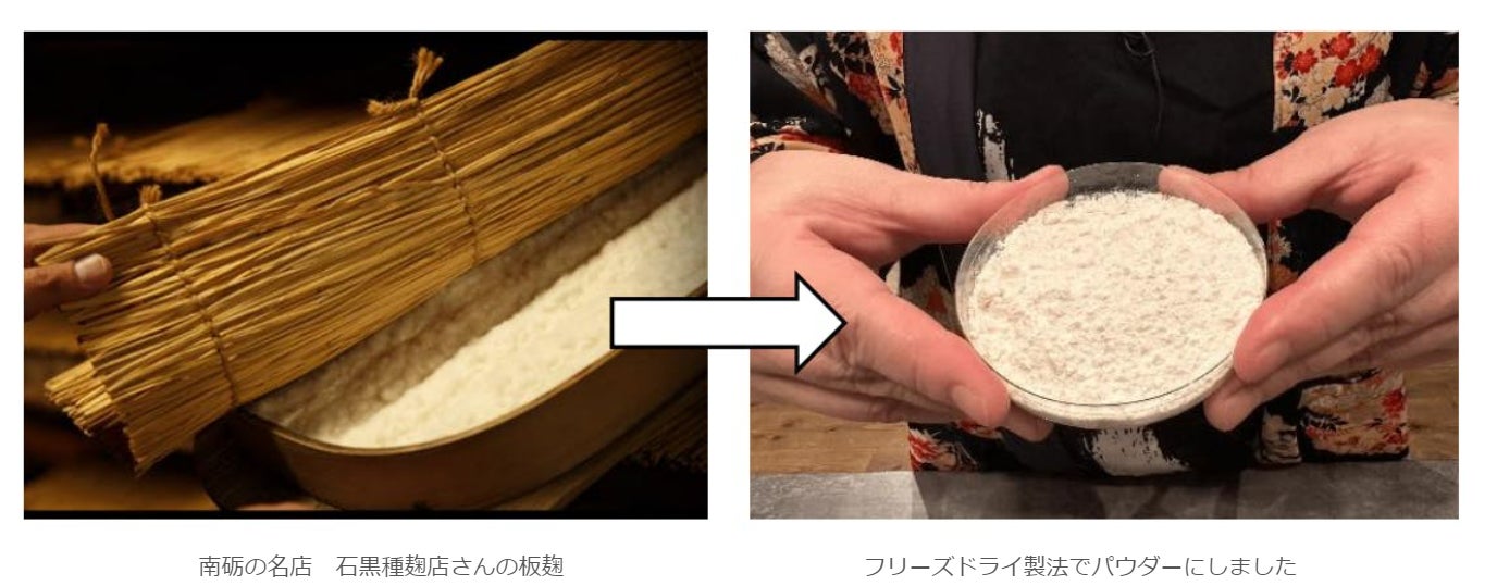 私の発酵郷土料理に欠かせないのが、名店・石黒種麴店の「麹」です。今回のプロジェクトでは要冷蔵の状態でないと流通が難しい麹をフリーズドライにすることで流通しやすく開発しました。麹提供をご協力いただいたのは、もちろん南砺の名店・石黒種麴店さんです。日本に数件しかない種麹屋さんで国内外に多数のファンをもち、一子相伝で上質の種麹を生産されています。今回私のたっての希望で、このスパイスの開発にご協力いただきました。