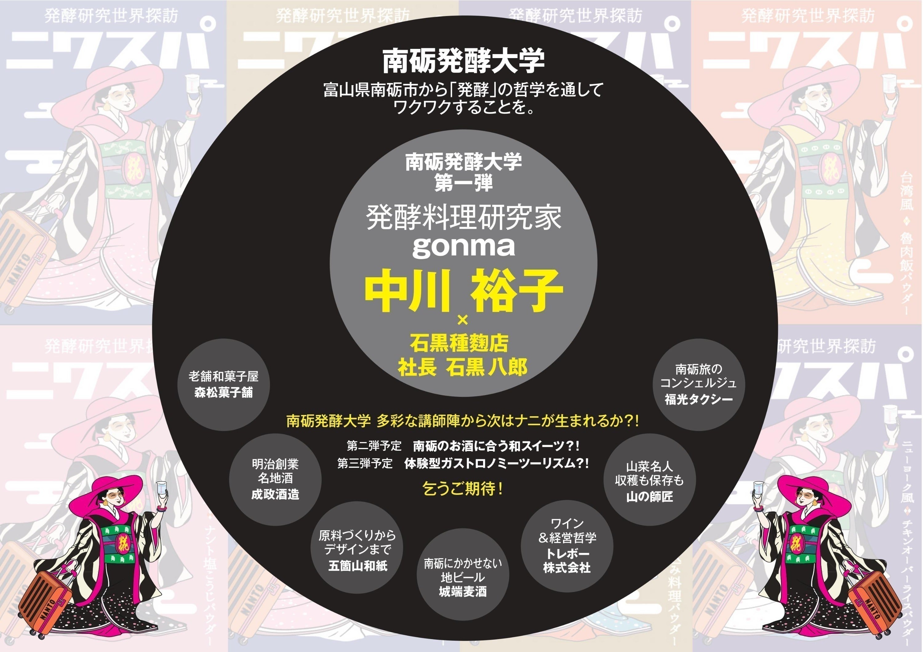 南砺は、名店・石黒種麴店をはじめ、冬の発酵料理の代表格・かぶら寿し、酒蔵・ワイナリー・ブルワリー、干柿やあんぽ柿など食の保存と発酵、また和紙(原料づくりから)など、おおくの「発酵」につながる技が数多くあります。その「発酵」をキーワードにし、市内をキャンパスとみたて地域の方々を講師として招き、その方の視点から「南砺」と「発酵」「息づく文化」を語ってもらい学べる企画です。講師となる方はその道の第一人者や職人、一般市民の○○名人など、多種多様。ひとくせも二癖もある先人たちから南砺の文化を、感じて・学んで・体験できる場です。伝統の技が息づく南砺で食文化にだけではなく、郷土文化、関わる人がより面白く発酵していく、そんなプロジェクトです。