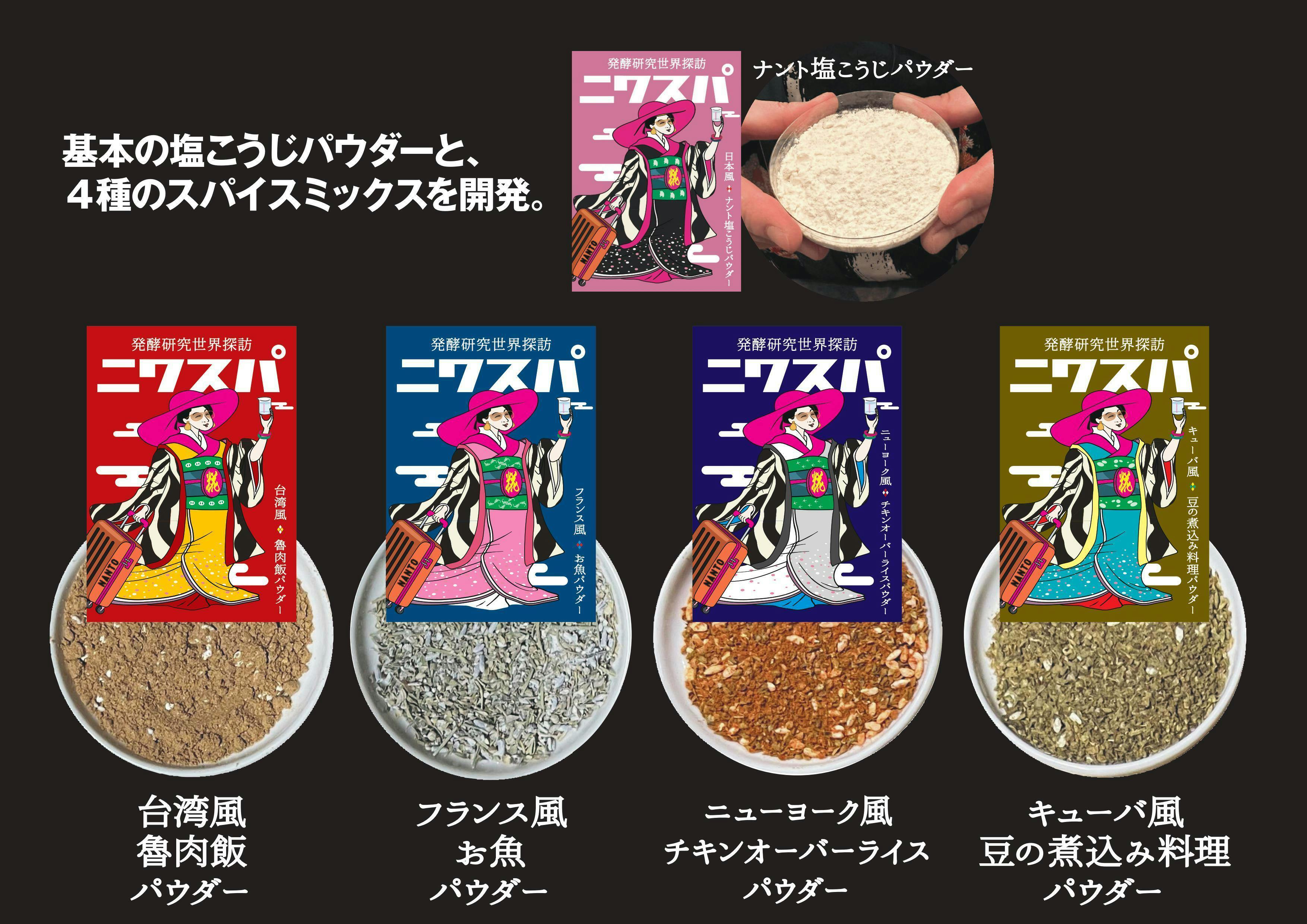 今回、フリーズドライに挑戦・完成し「基本となる塩麹」ができたことで課題解決。それを活かし、当店(gonma)で提供する世界の郷土料理をご家庭でも味わえるようにと、スパイスミックス4種も同時に開発しました。どれも当店でファンの付く美味しい各国メニューです。世界の料理を通して日本の国菌が旅たちます。