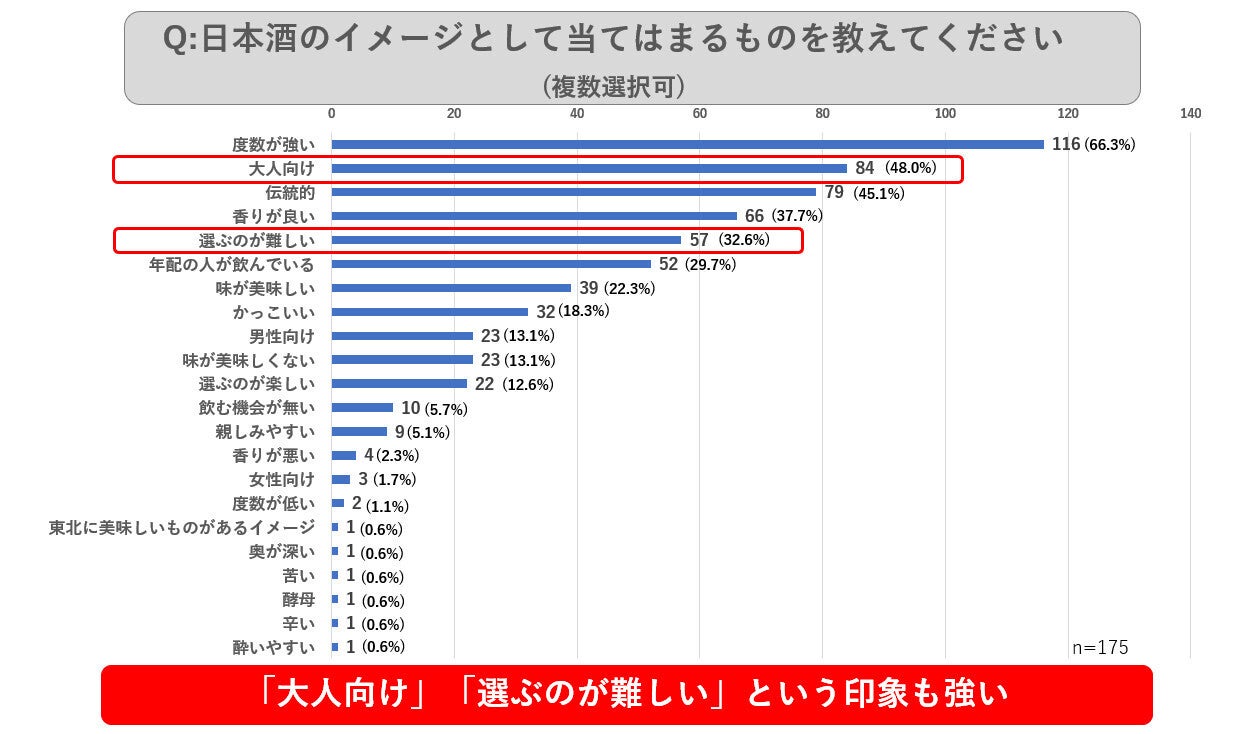 「伝統的」「香りが良い」という印象とともに、「大人向け」「選ぶのが難しい」という印象も強いことが分かります。このあたりも、日本酒を手に取らない理由になっているようです。
