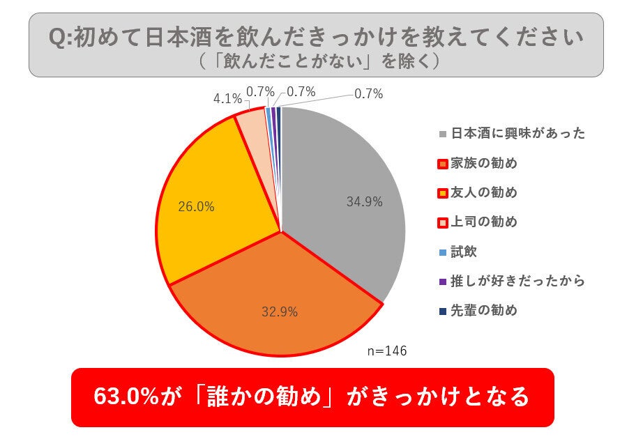 もともと「日本酒に興味があった」という以外では、63.0%の人が「誰かの勧め」がきっかけとなっていることが分かります。
