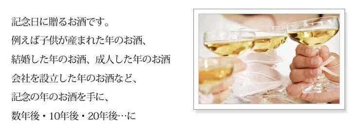 記年美酒(きねんびしゅ)シリーズは、一人一人の記念したい年のお酒を保存したり乾杯したり、思いを形にするお酒。ヴィンテージワインのように保管も気を遣わずに、徐々に色合いの変化も楽しむことができます。いつ乾杯しようか、誰と飲もうか、思いある年を共有する人たちと先のお楽しみをいかが?