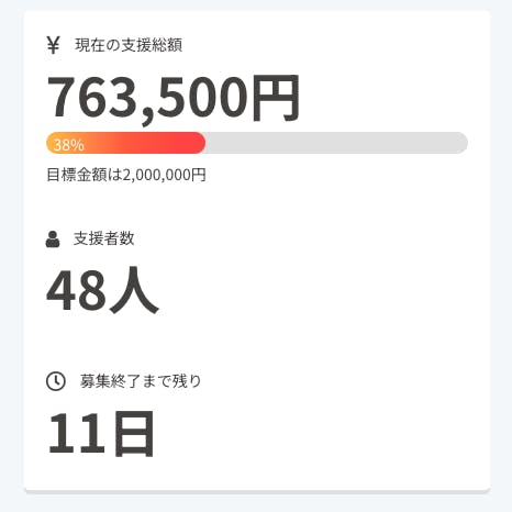 皆様のご支援、ご協力誠にありがとうございます。現在38%、763,500円を達成しております。