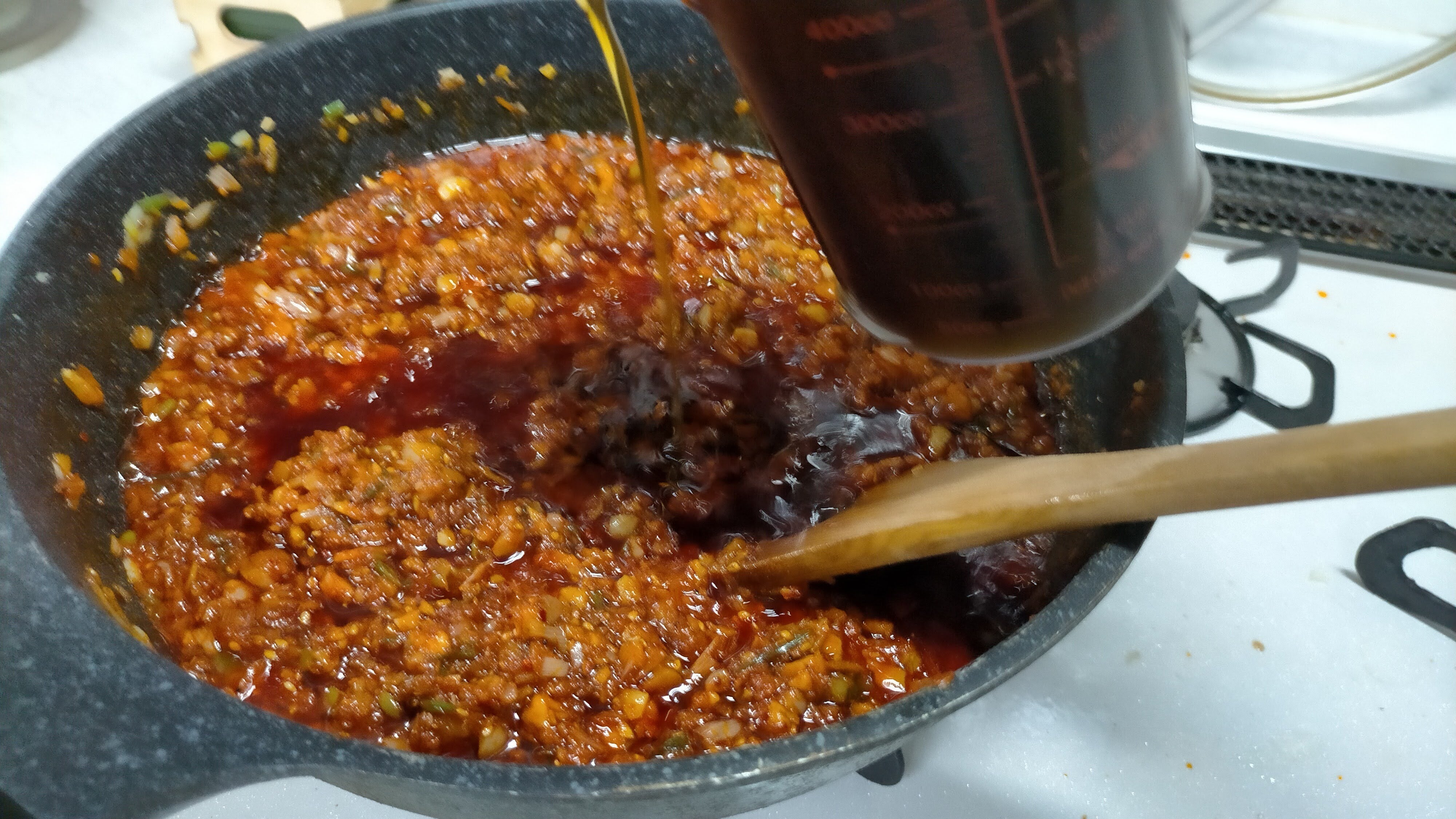 仕上げに香りの強い韓国産ごま油を混ぜていきます。