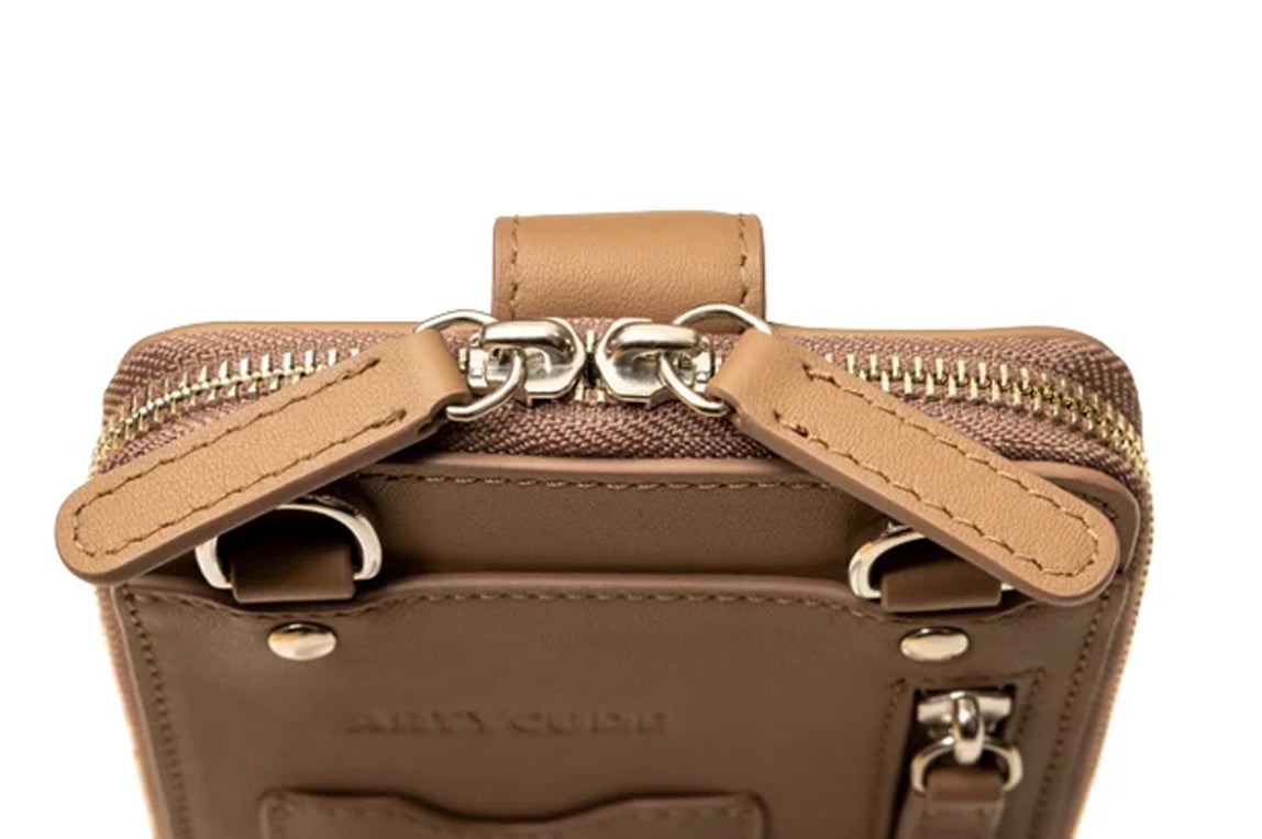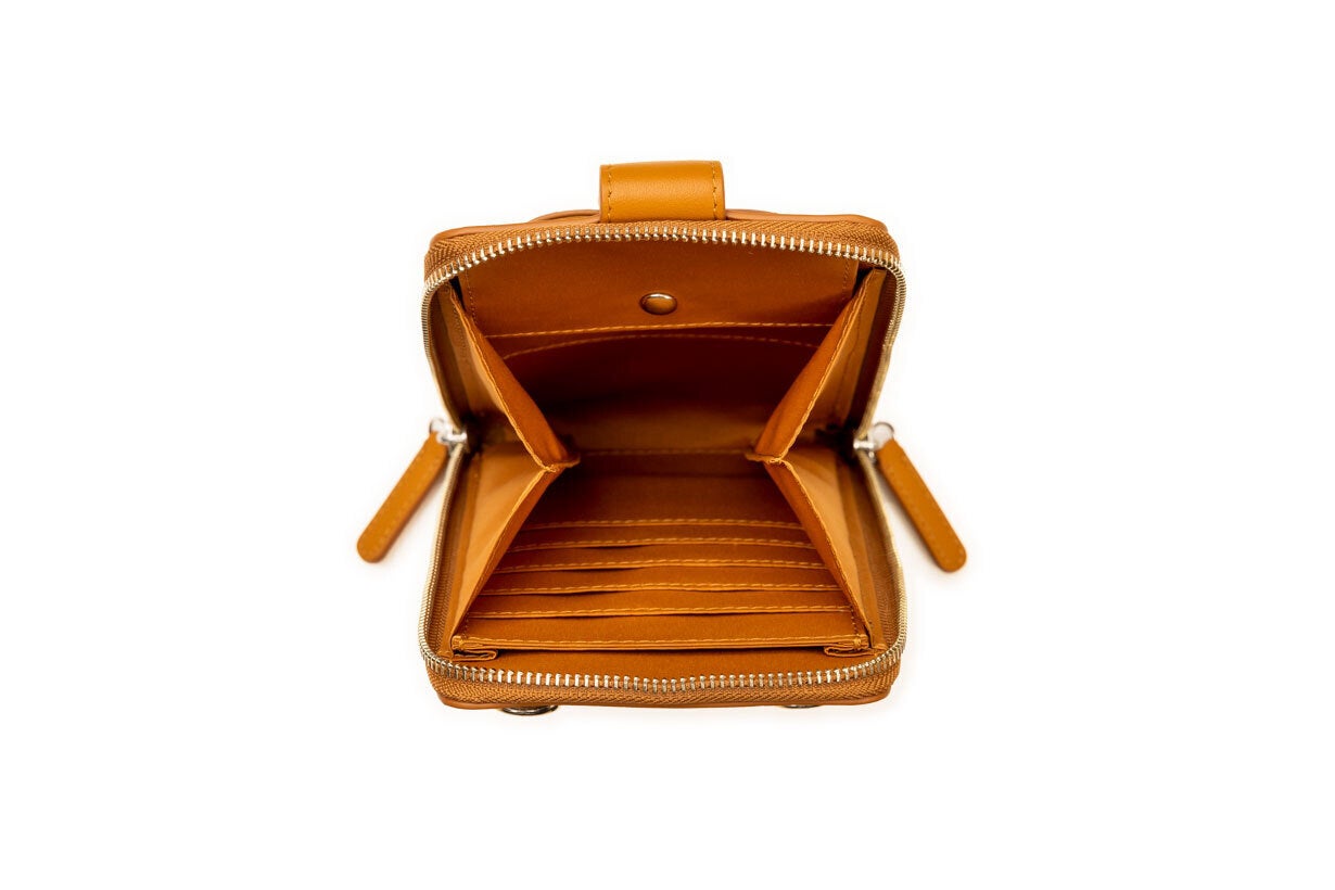 カード、紙幣、コイン、キー、パスポートなど全ての物が一度に取り出しやく見やすい構造にし、背面には交通カードポケット、マスク、カードなど入れられるZIP付ポケットを取り付けました。