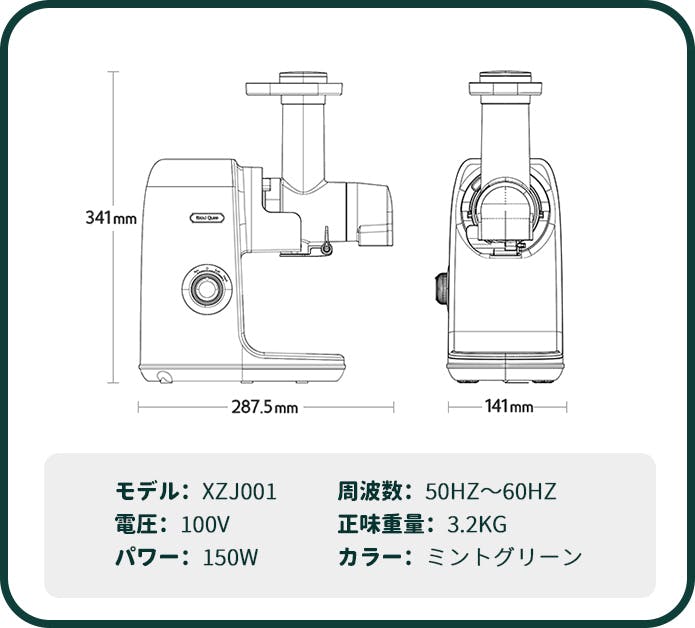 スロージューサーのシンプルで忘れられないスタイルは、あらゆるキッチンを彩るのに最適です。 特別さ、表現力、エレガンスといった時代を超えた資質に根ざした特許取得済みのデザインは、シンプルな構造とミントグリーンと貴重なノスタルジックカラーを融合させ、どの家庭にも調和とくつろぎの空間を提供することができます。 また、コンパクトな設計のため、様々なシーンで使いやすく、様々な大きさのキッチンに置いても楽しくお使いいただけます。