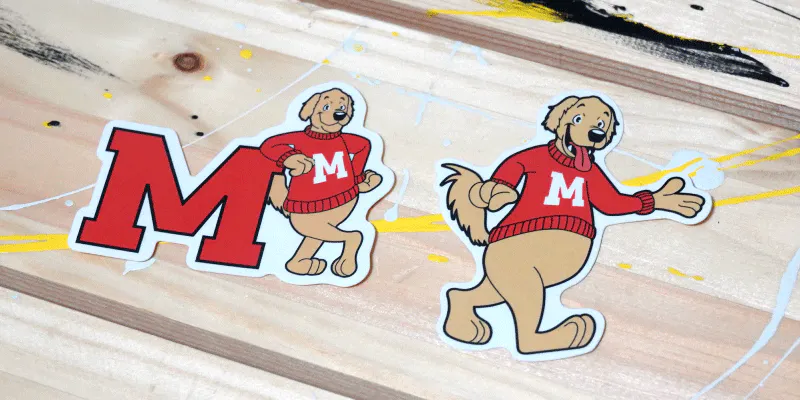 マスコットのメイプル単体のステッカーとMロゴが特徴的なイラストの2枚セットです。