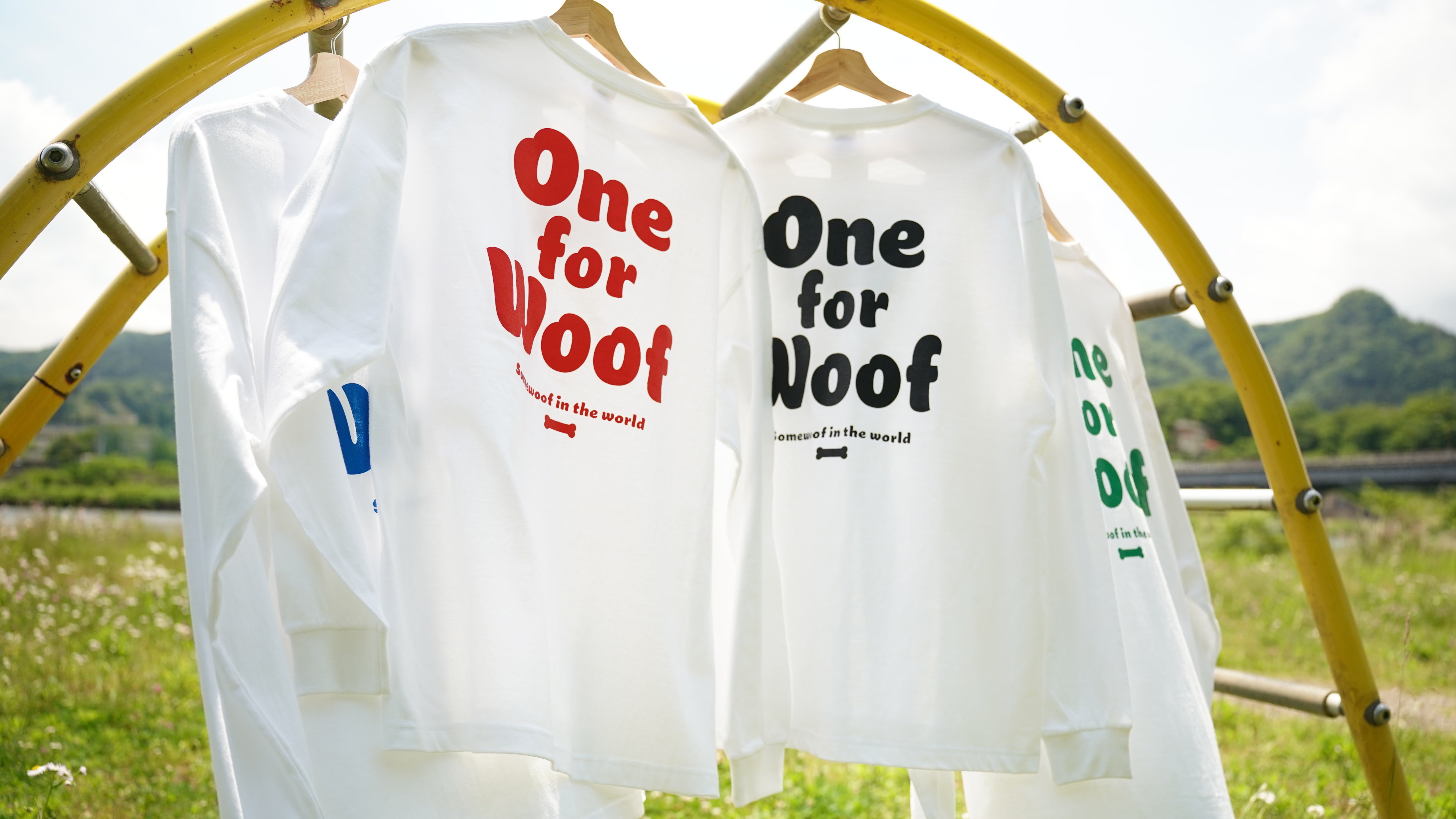 "One for Woof"という言葉は「Oneが犬(Woof)のために」という意味を込めています。