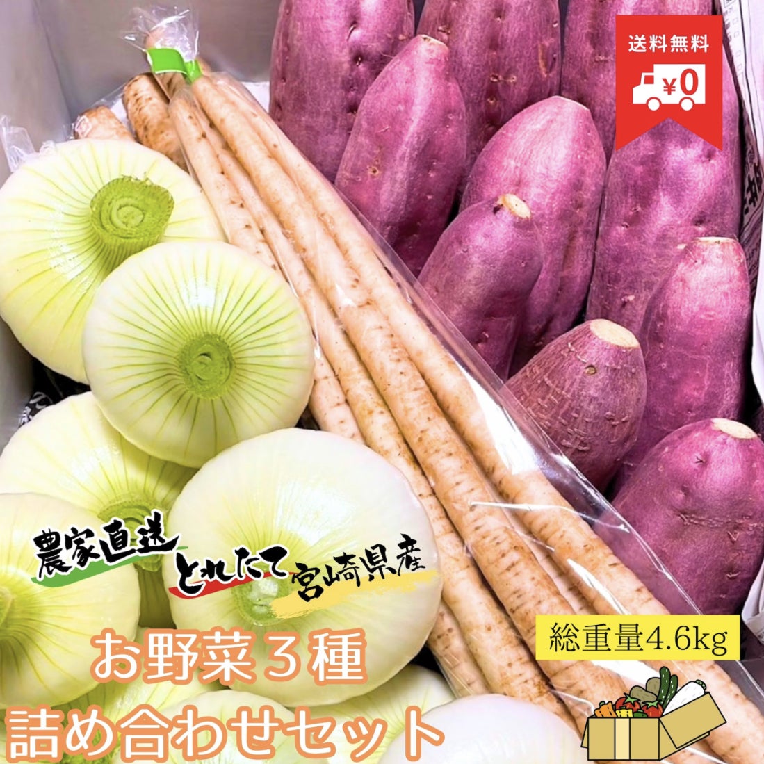 リターン例:宮崎県産 土壌改良剤を配合した土で育てた美味しいお野菜詰め合わせ3種類セット合計4.6kg[サツマイモ2kg,ゴボウ600g,玉ねぎ2kg]| クール便にてお届けいたします!