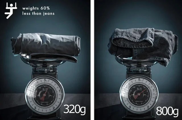 一般的なワークパンツやジーンズと比較すると、収納時のスペースに不思議な程に違いがあるのが分かります。