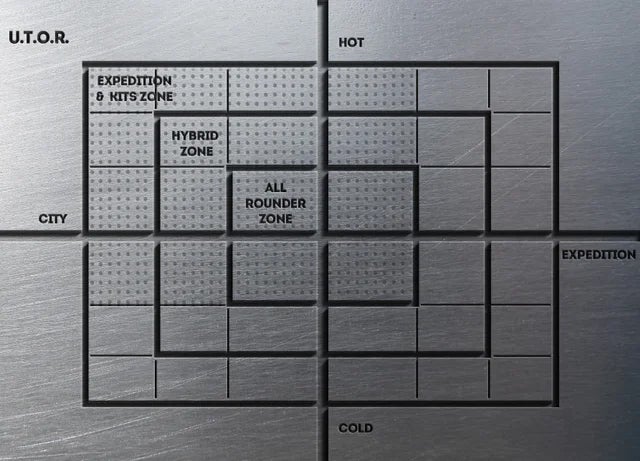 『オールラウンダー』と名乗るからには、グラフの中心にある4つの象限をすべてカバーする必要があります。オールラウンダーパンツは、この4象限をカバーするだけでなく、「ハイブリッドゾーン(中枠)」の象限(12本のうち5本)と「エクスペディション&スペシフィックゾーン(外枠)」の象限(20本のうち7本)を加えた、計16象限をカバーしています。