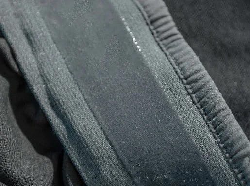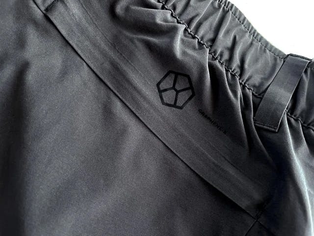 T800撚糸105gsmポリエステルを使用し、体の動きに合わせて影のように伸びるパンツに仕上げました。通常、この生地は横方向の2WAYストレッチですが、4方向全てに伸びるように作りました。更に横糸にグラフェンを使用することで、激しい動きにも耐えられる、グラフェンの特性を活かした生地に仕上げました。