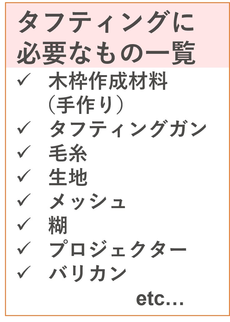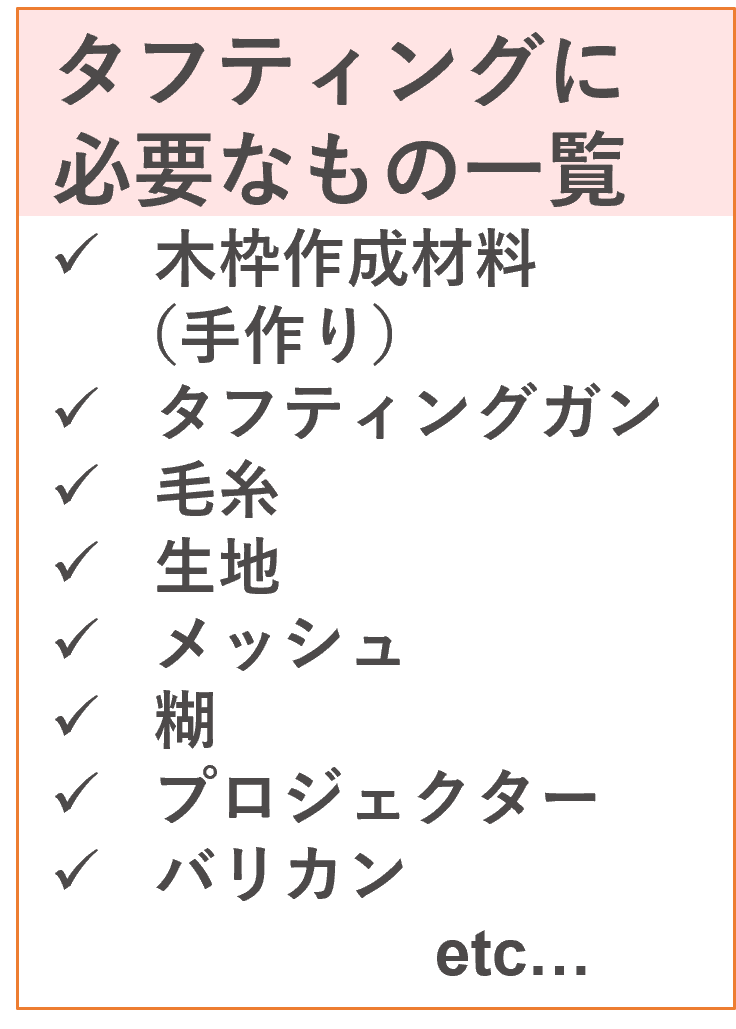 また、タフティングは見た目以上に必要なモノが多い上に、その機材や材料のほとんどが日常で使うものではないため、仕入れることが簡単ではありません。