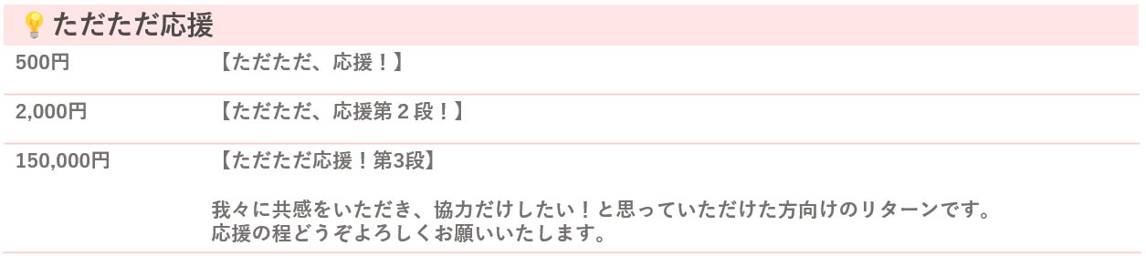 今回のリターンのご紹介をさせていただきます。リターンは大きく3つのカテゴリーに分けて複数ご用意いたしました。ぜひご覧になってみてください。