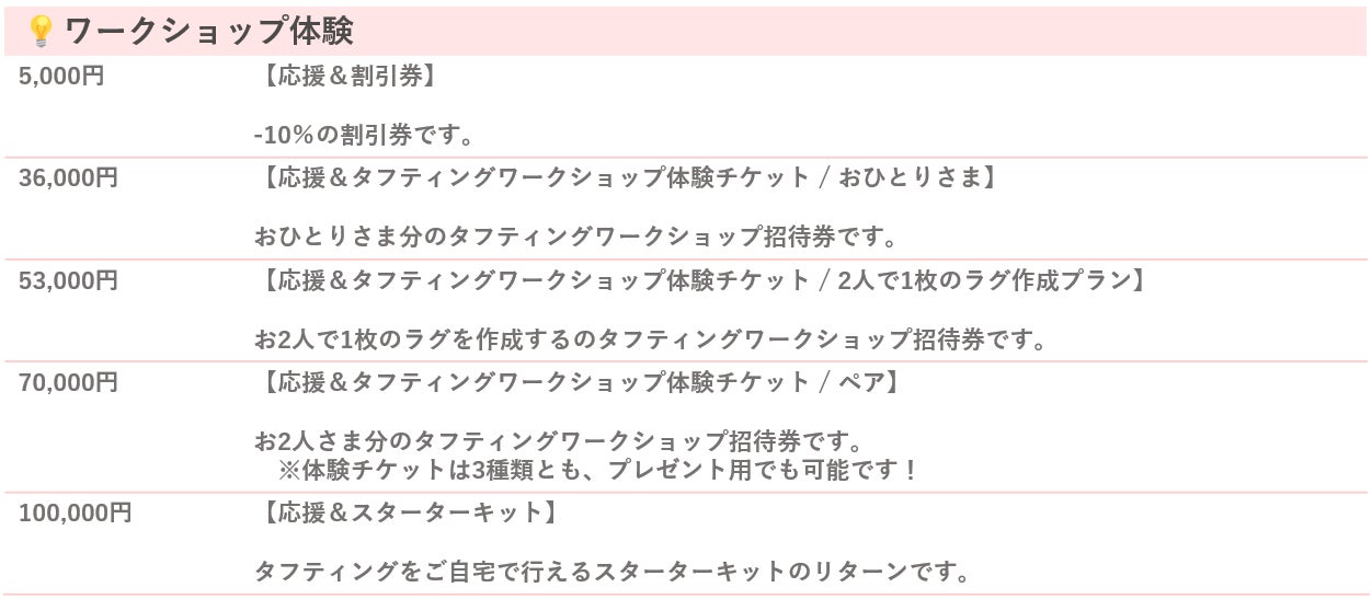 今回の目的は、この記事を通して応援いただき、実際にハンドメイドのラグをお手に取っていただくことです。そして応援していただいた費用の一部は、新規店舗のオープン費用として活用をさせていただこうと考えております。これが、中長期的なタフティングの普及です。