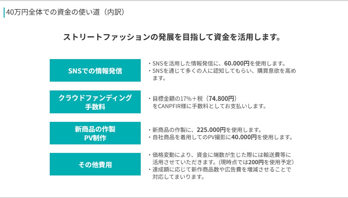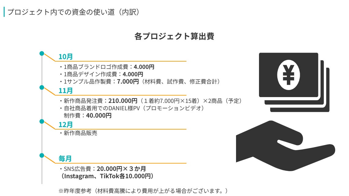 達成額にもよりますが、冬物商品を作製し、それに必要なロゴ作成費等にも資金を活用する予定です。