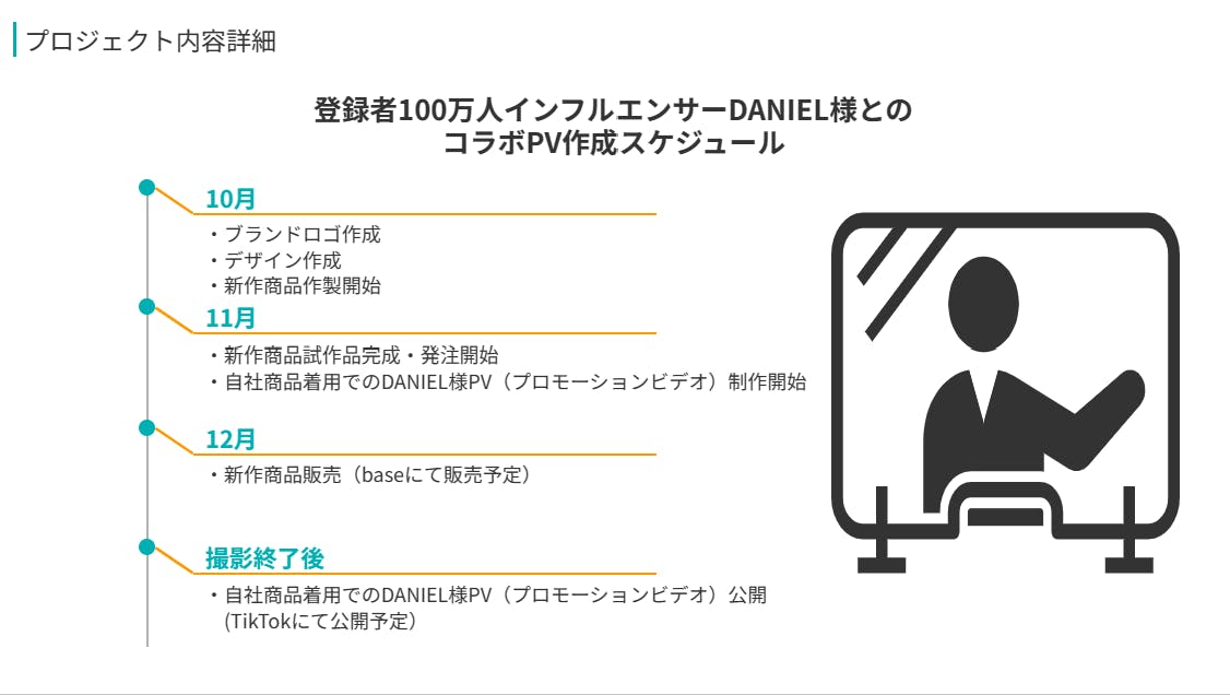 具体案としてはZ世代へのアプローチ(インフルエンサーのファン層を顧客ターゲットとして選定)を図ります。