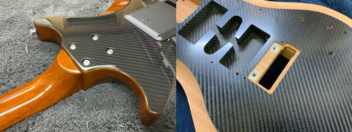 ボディ、ネックにはCFaRPの特性とマッチングしやすく、鳴りを引き出せるようにマホガニーを採用していますが、木材の特性により強度が弱く、力の掛かる箇所、ビスが入る箇所は崩れやすく、鳴りを損なう原因となってしまいます。