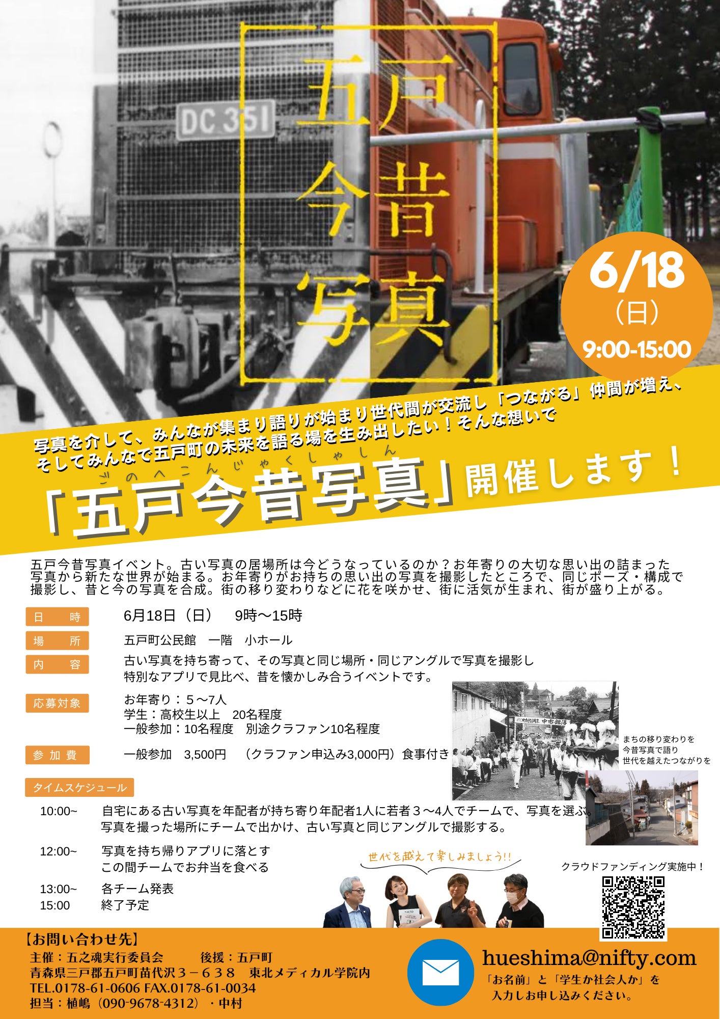 お年寄りと若者が昔の写真を撮った場所を探し、昔と同じアングルで写真を撮る。それを開発中の五戸今昔写真アプリで昔の写真と合成。記念すべき第一歩を共に踏み出しませんせんか!