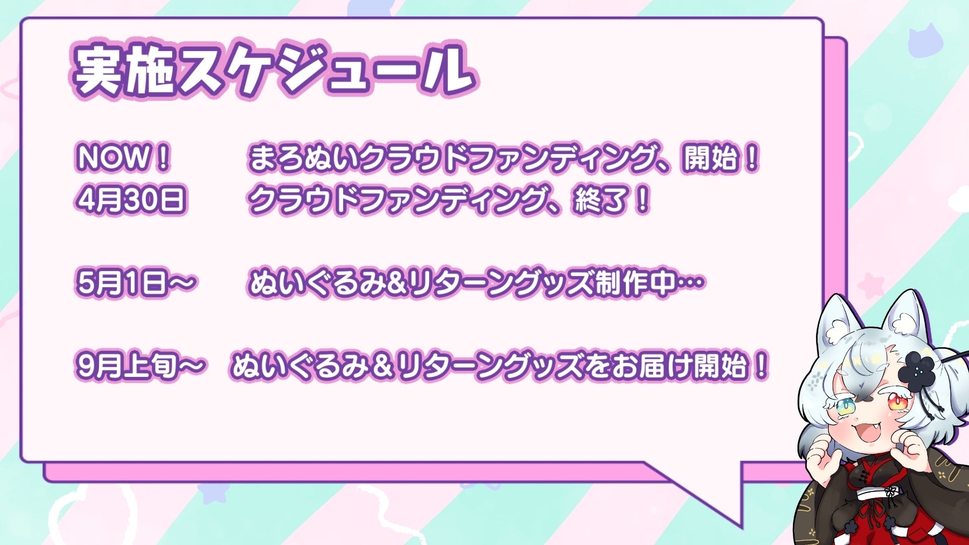 •  お久しぶりじゃ! そしてお世話になっております。まろじゃよ!今回は5月31日に無事、本クラウドファンディングの支援金が入金完了したことによって、ぬいぐるみ生産がいよいよ開始したことをお知らせにきたのじゃ!クラウドファンディング終了から1ヵ月、早めにぬいぐるみサンプルの制作が終わったことによってスムーズに増産が開始できた!これからどんどんまろぬいが作られていくことを考えると……何とも言えない気持ちになるな?というわけで、今後のスケジュールに関して少しお知らせじゃよ!今後のまろぬいクラウドファンディングのスケジュールは下記のような流れじゃ。ぬいぐるみの生産完了は7月末、リターングッズの送付は早くて8月、遅くとも9月以内には完了する見込みじゃ!皆のお手元にはやくぬいぐるみを届けられるよう、頑張るのでもう少しだけ待っていておくれ! もっと見る