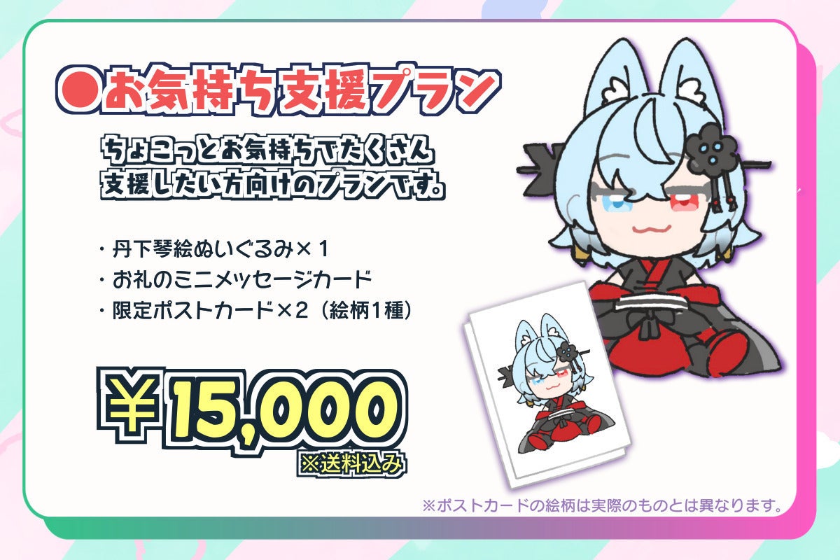 15,000円プランの方は、ちまめ様の描きおろしイラストポストカード(絵柄一種×2枚)がつくぞ!