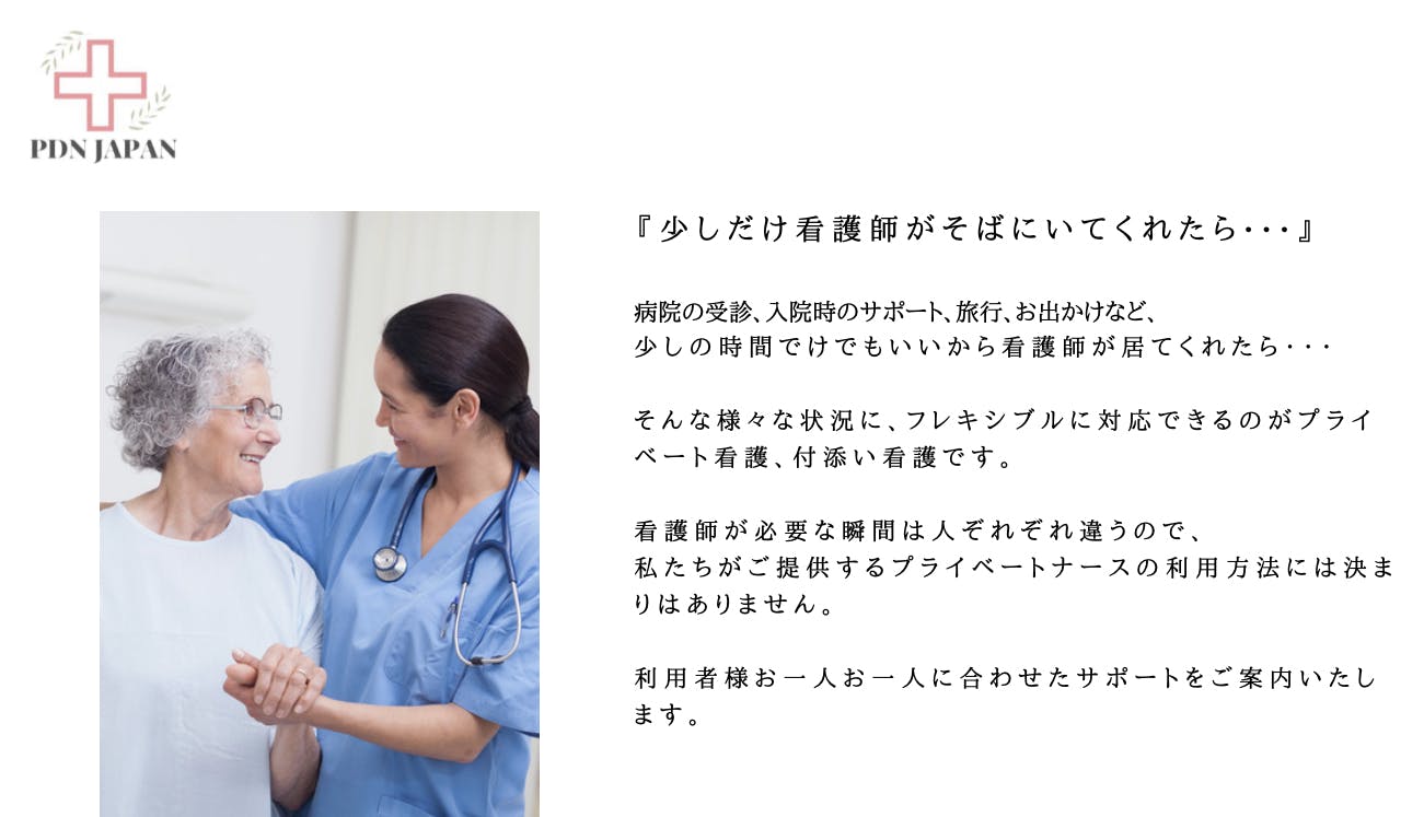 現在の訪問看護の仕組みは、介護認定を受けている方が対象であることが多いのですが、我々PDNJapanの対象者は、介護保険が適応される65歳以降はもちろん、高齢者でも介護認定を受けていない方、65歳までの乳児から成人などあらゆる方のサポートを実施いたします。介護保険や医療保険での看護サービスという医療・介護提供だけではなく