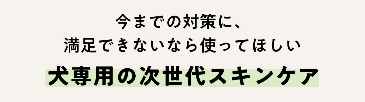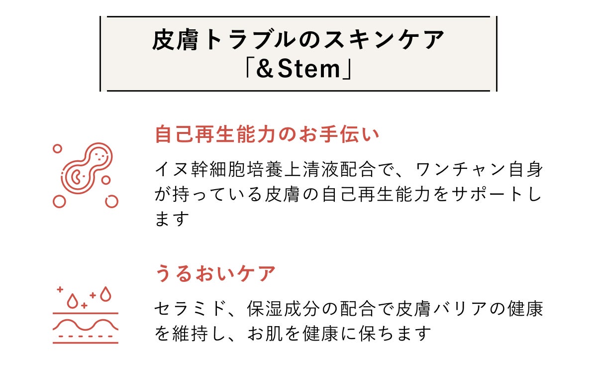 その第一弾として着目したのが、ワンちゃんのお悩みナンバーワンのお肌のトラブル。「幹細胞」に着目し、スキンケア商品の開発を試みました。飼い主様とワンちゃんをお悩みから解放し、健やかな姿を取り戻すお手伝いができる様、どこまでもチャレンジを続けていきます。製品を通して、たくさんのスキンシップが生まれます様に。願いをこめて。