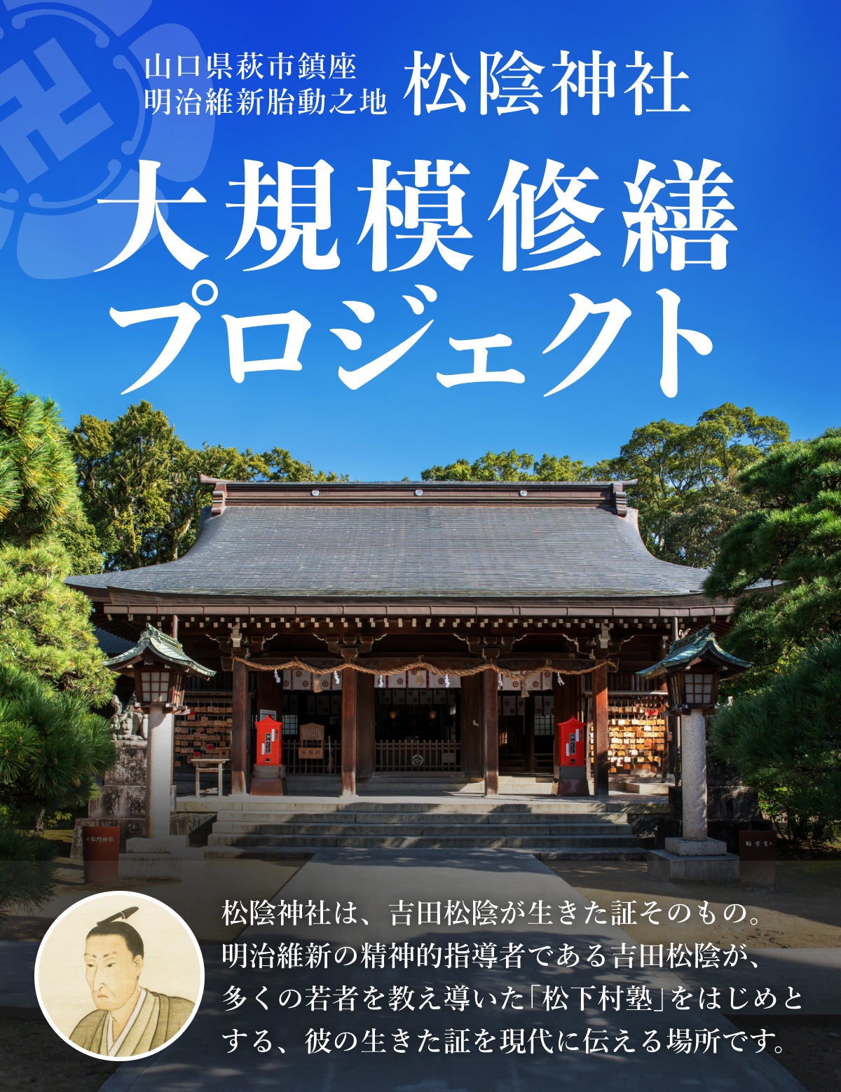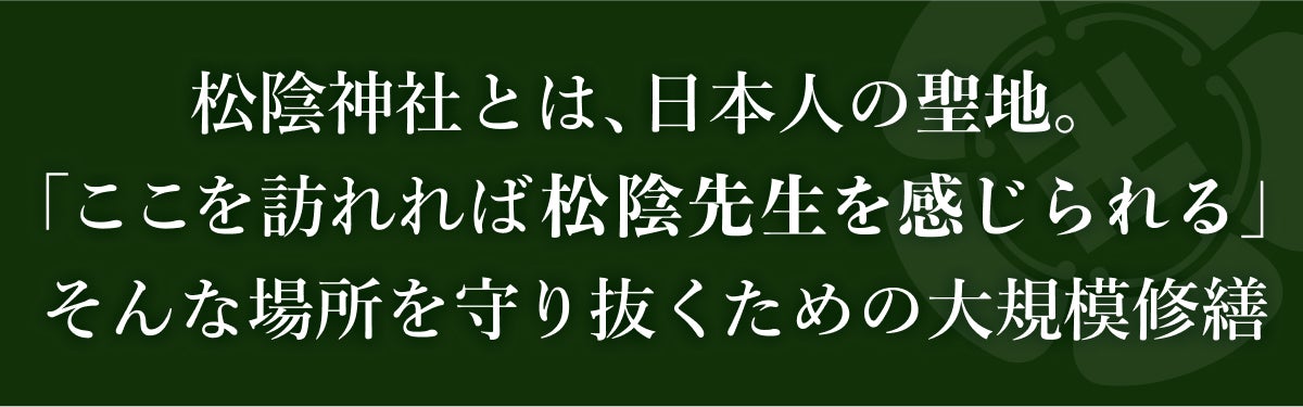 本プロジェクトでの支援は、境内の修繕のみではなく松陰先生の功績を後世に残すための重要な一助ともなります。たとえ少額でもその気持ちは非常にありがたく、松陰先生を慕うお心を伝える手段のひとつとして、ぜひご支援をお願いいたします。