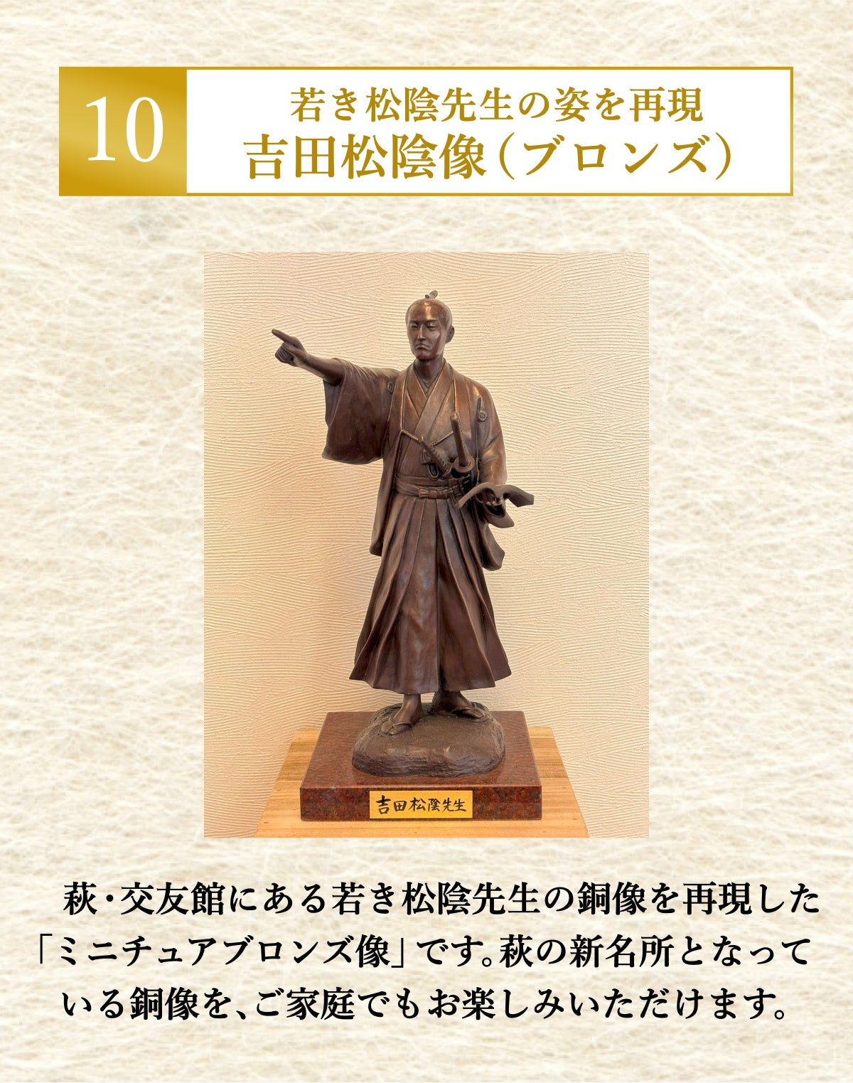 「交友館」に建つ吉田松陰先生のブロンズ像は、山口県萩市「松陰神社」ご協力のもと神社所蔵の「吉田松陰先生自賛肖像」をモチーフに、令和4年3月に建立されました。日展審査員を務め、全国各地で偉人・著名人像の制作実績をもつ田畑 功氏の手により、若き日の松陰先生の姿がよみがえりました。本品は、これを同 田畑功氏の手によりミニチュアとして完全再現したものです。