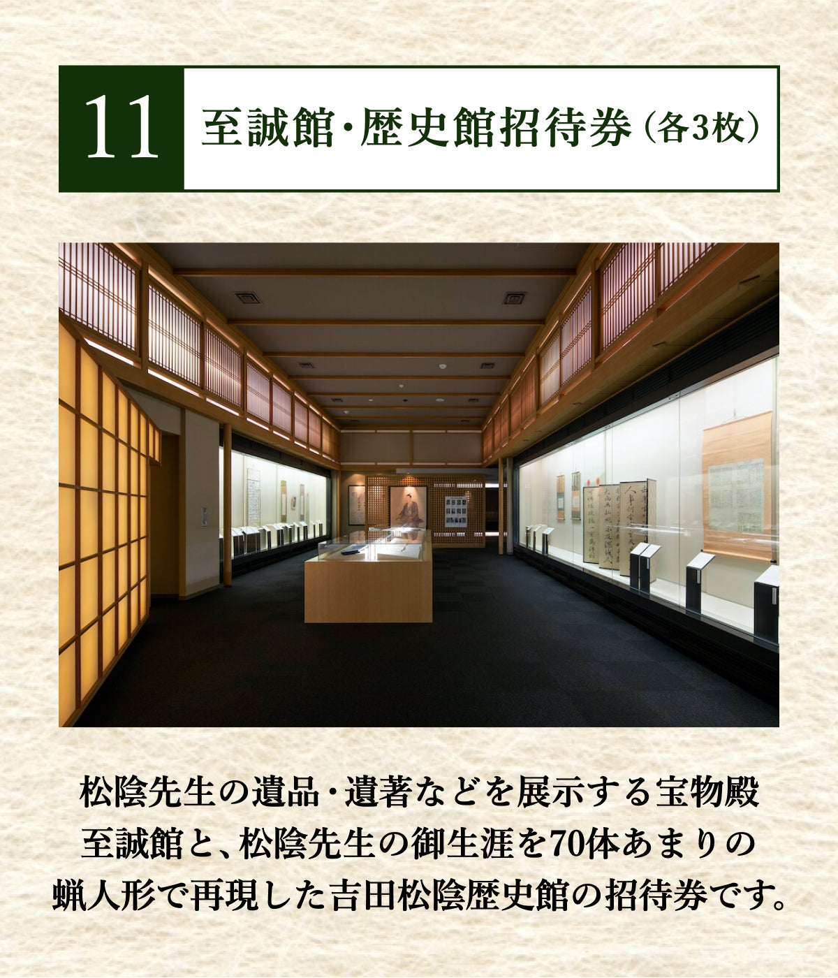 松陰先生の遺品・遺著などを展示する宝物殿至誠館と、松陰先生の御生涯を70体あまりの蝋人形で再現した吉田松陰歴史館の招待券です。