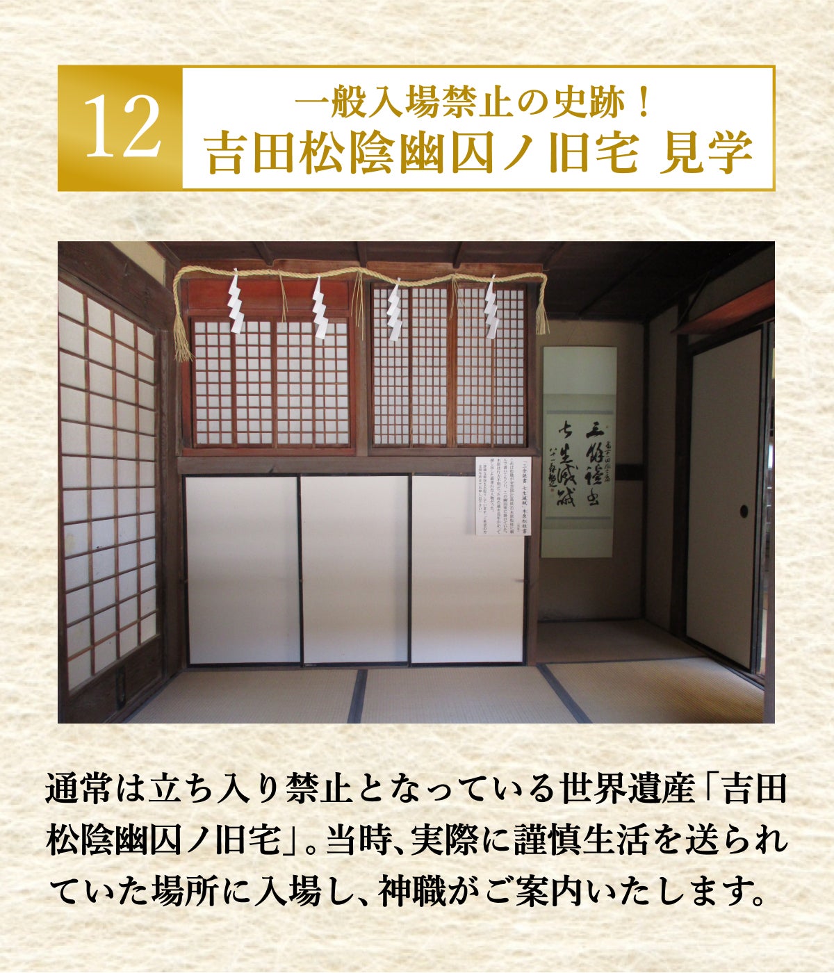 世界遺産「吉田松陰幽囚ノ旧宅」の中に入場して神職がご案内いたします。通常は立ち入り禁止となっており、貴重な体験をしていただけます。