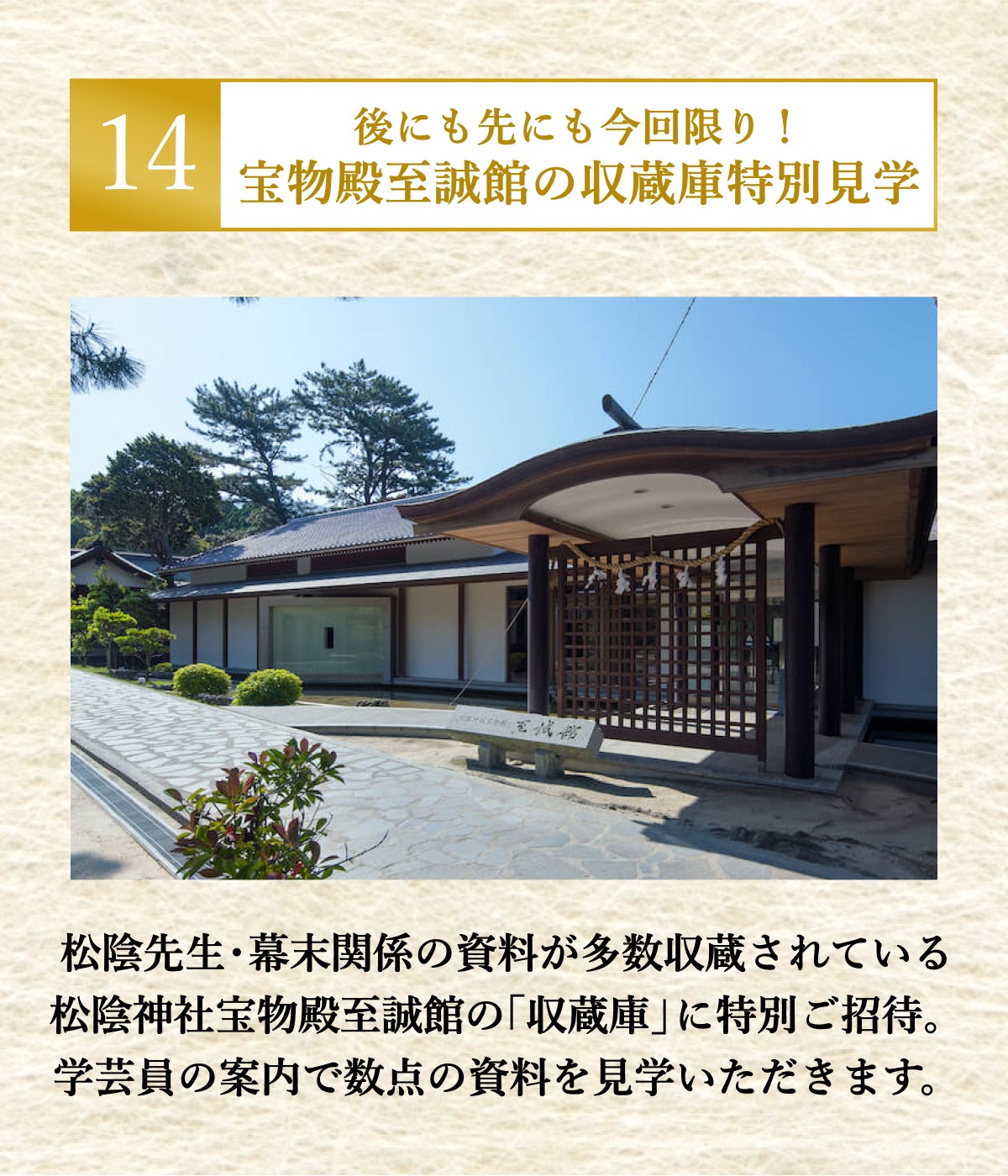 松陰先生・幕末関係の資料が多数収蔵されている松陰神社宝物殿至誠館の収蔵庫に特別入場いただき、学芸員がご案内、数点の資料を実際に収蔵庫内で見学いただきます。