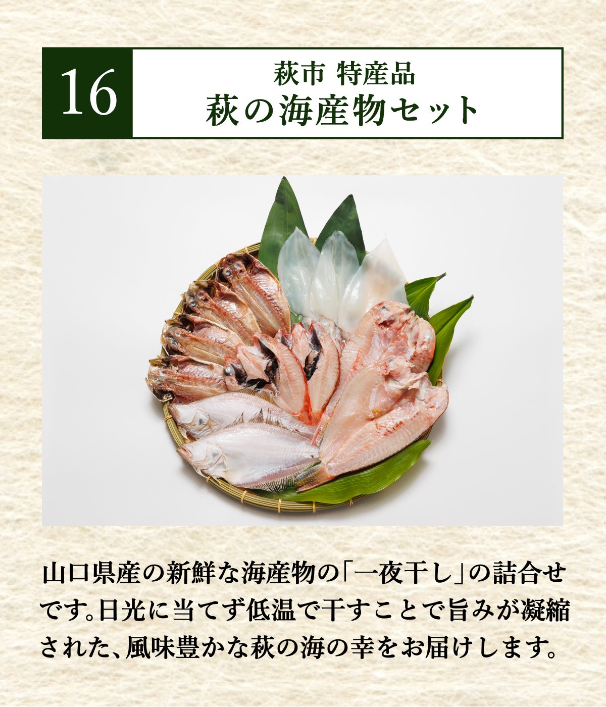 山口県萩市の特産品をお届けします。地元で採れた海産物や江戸時代から続く伝統工芸など、萩市の魅力を堪能しながらプロジェクトを応援いただけるコースです。